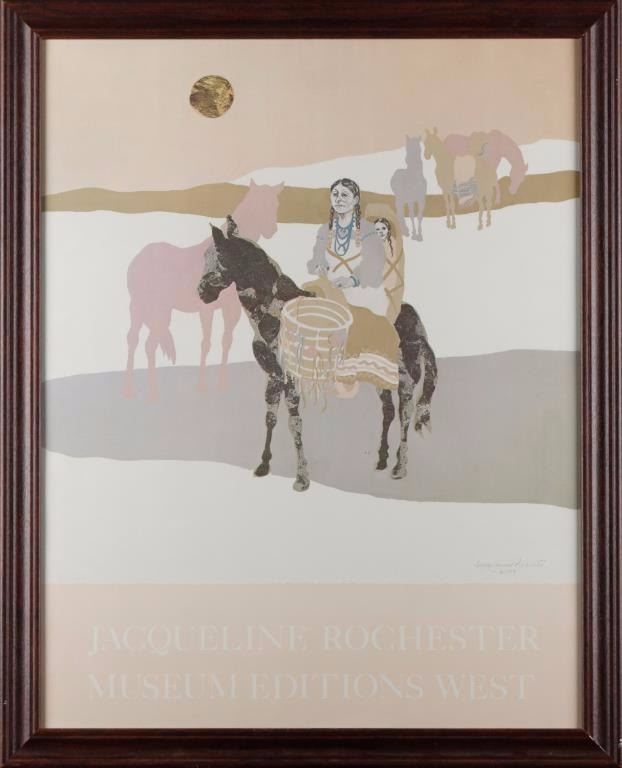 Large framed color print of Indian woman with child on horseback by Jacqueline Rochester (1924-2010) advertising Museum Editions West, approximately 32” x 25” overall. Est.: $50-$100.