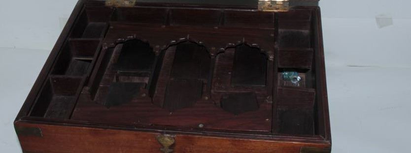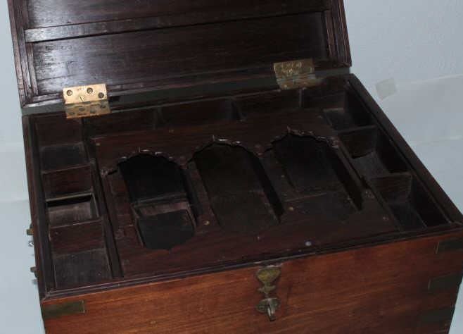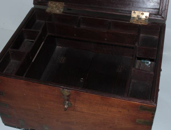 Antique Specimen Chest circa 1879. The chest is constructed of hardwood with ornamental brass hardware. The dimensions of the chest are 15” high by 24” across and 17 ½” deep. Upon opening the chest, the interior appearsto be a teak-like hard wood which features compartments and a trapdoor bottom. There are extra partition pieces and the size and number of compartments can be manipulated. The top features wooden rails used to holditems as well. The exterior has a wonderful, old appearance with the brass taking on a great patina. An interesting conversation piece. Est.: $300-$500.