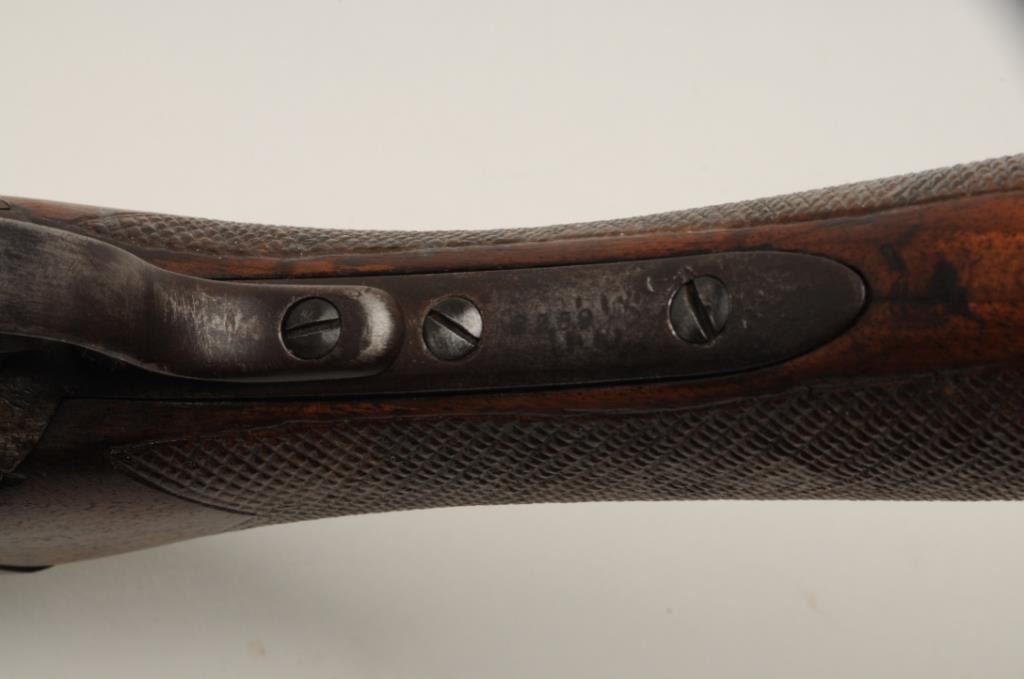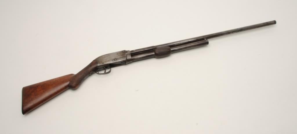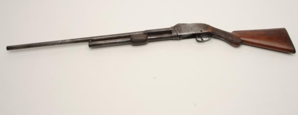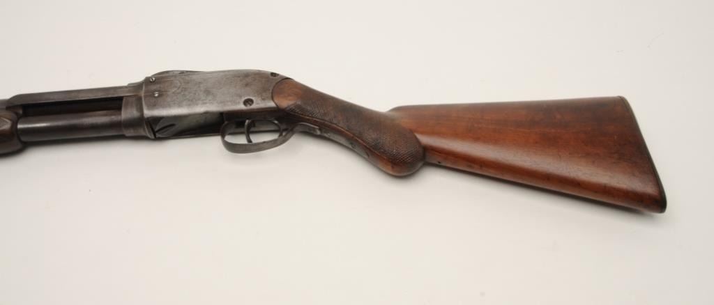 Spencer Arms pump action shotgun, 12 gauge, 30” barrel, checkered wood butt stock, S/N 2259, in overall good condition with a grey/brown patina to metal surfaces, crisp action, good markings and fair bore; wood isoverall good with checkered hard rubber butt plate and checkered hard rubber pump grip. (Antique). Est.: $600-$1,200.