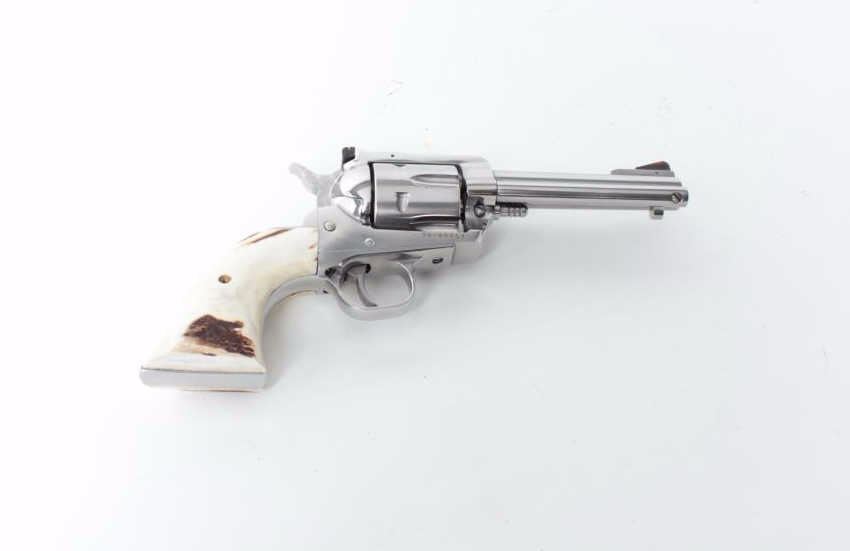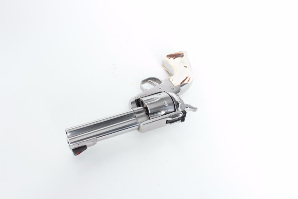 Ruger New Model Blackhawk single action revolver, .357 caliber, 4.75” barrel, stainless steel, jeweled hammer and honed action, stag grips, S/N 36-65457, in overall fine to excellent condition.(Modern/PPT). Est.: $350-$700.