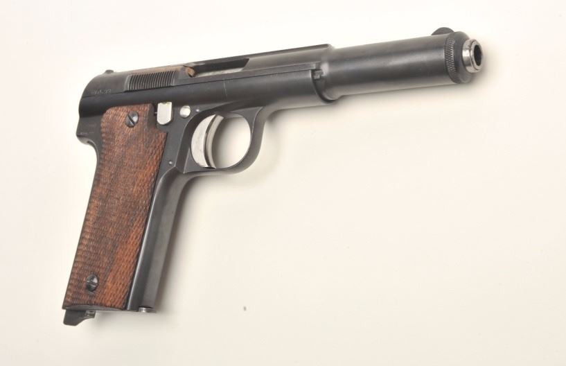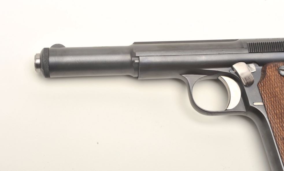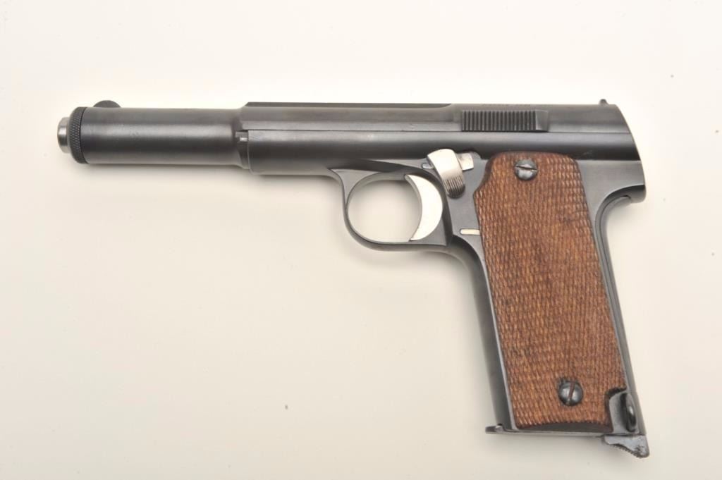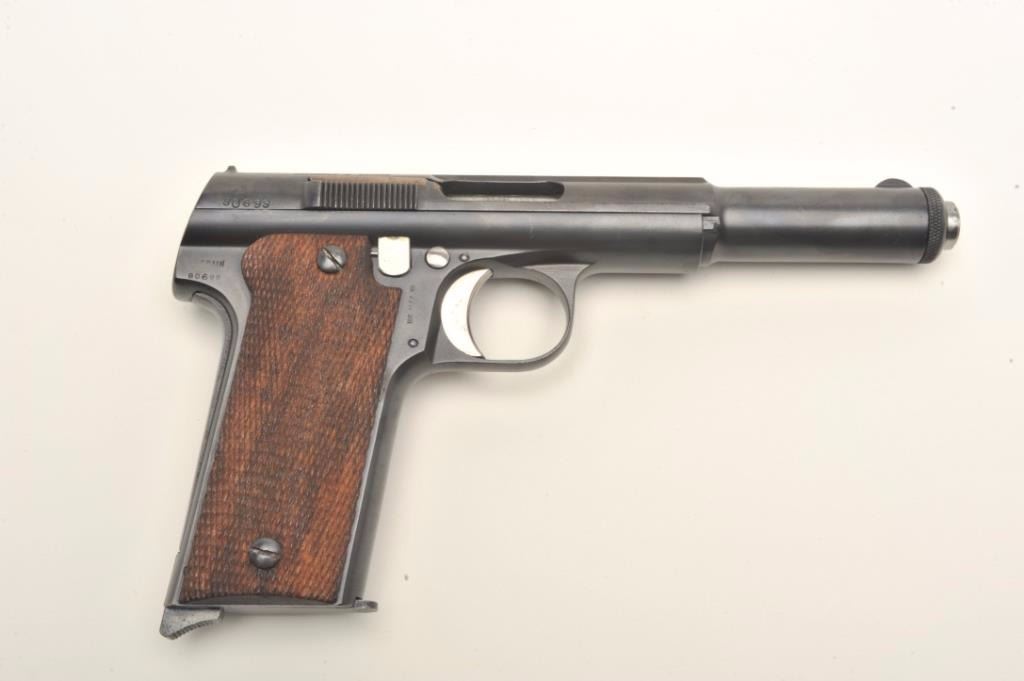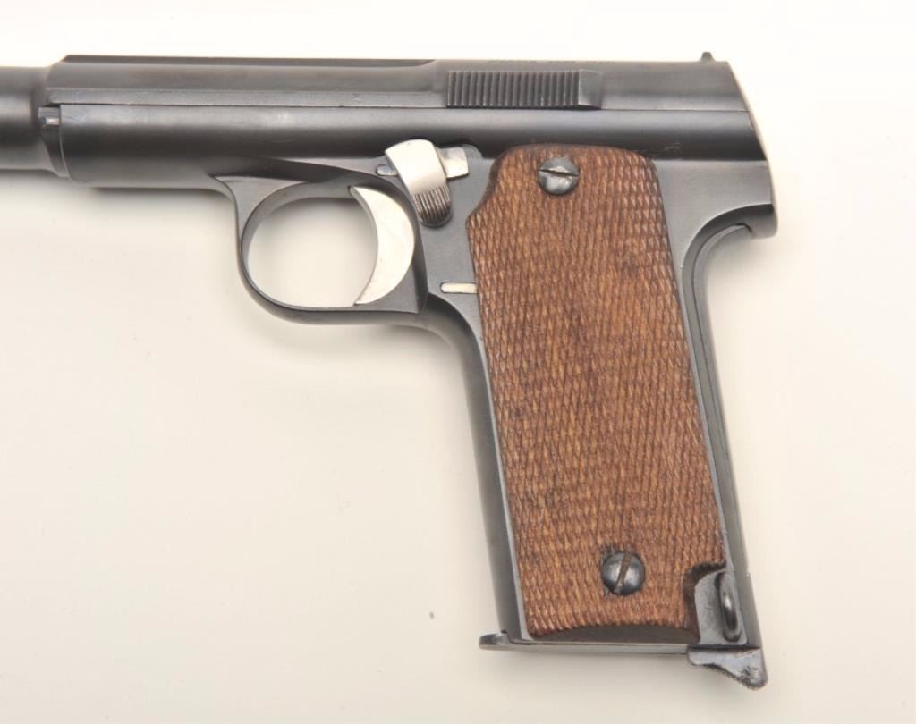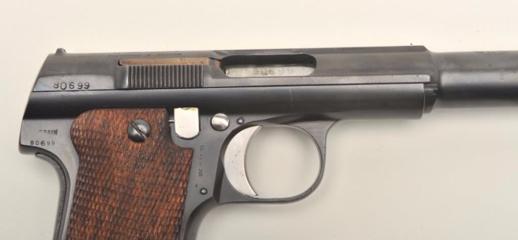 Astra Model1921 (400) semi-automatic pistol, 9mm caliber, 6” barrel, import-marked, blued finish, checkered wood grips, S/N 80699 (barrel marked 90699), overall very good + condition showing majority of its muted blued finish, very good bore, crisp action, very good markings and grips. (C&R/PPT). Est.: $300-$600.
