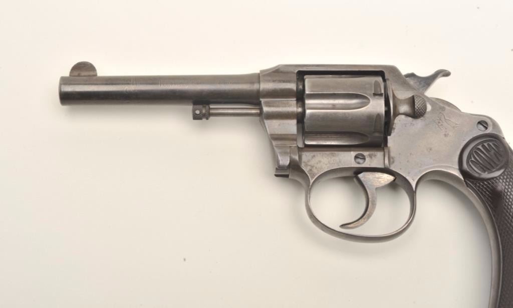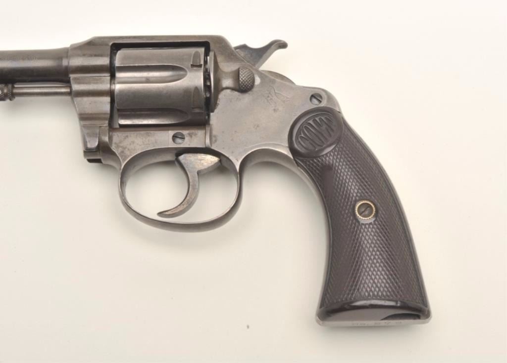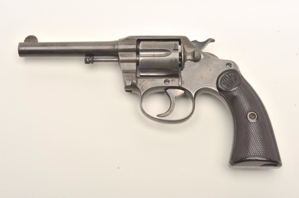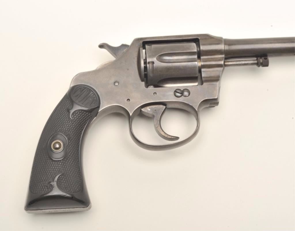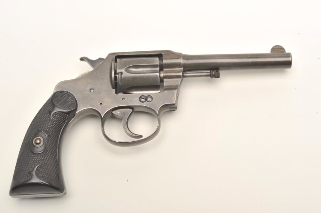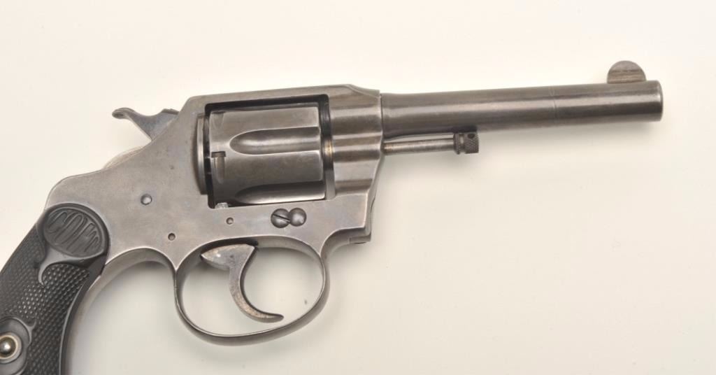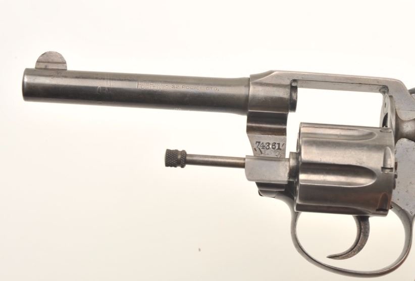 Colt Police Positive DA revolver, .32 caliber, 4” barrel, checkered hard rubber grips, S/N 74361, overall good + condition with a grey patina to metal surfaces, very good bore, crisp action, good markingsincluding what may be a police department inventory “No. 276” on butt; grips show wear and an old chip to the bottom of the left grip; successful bidder should send for a Colt factory letter as this one may have been shipped directly to a police dept. (C&R/PPT). Est.: $200-$400.