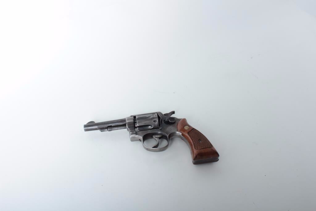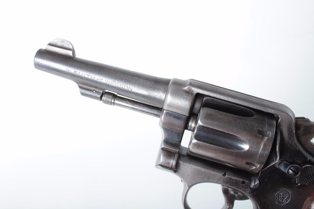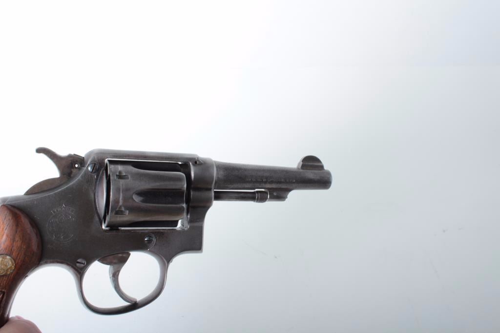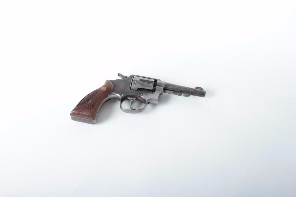 Smith & Wesson DA revolver, 5-screw frame, .38 Special caliber, 4” barrel, dark patina to metal surfaces, S/N 369954 (frame and cylinder), barrel is S/N V432408); overall fair to good with good action and jeweledtrigger, good markings, fair bore and good checkered wood medallion grips. (Modern/PPT). Est.: $200-$400.