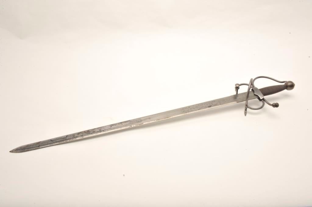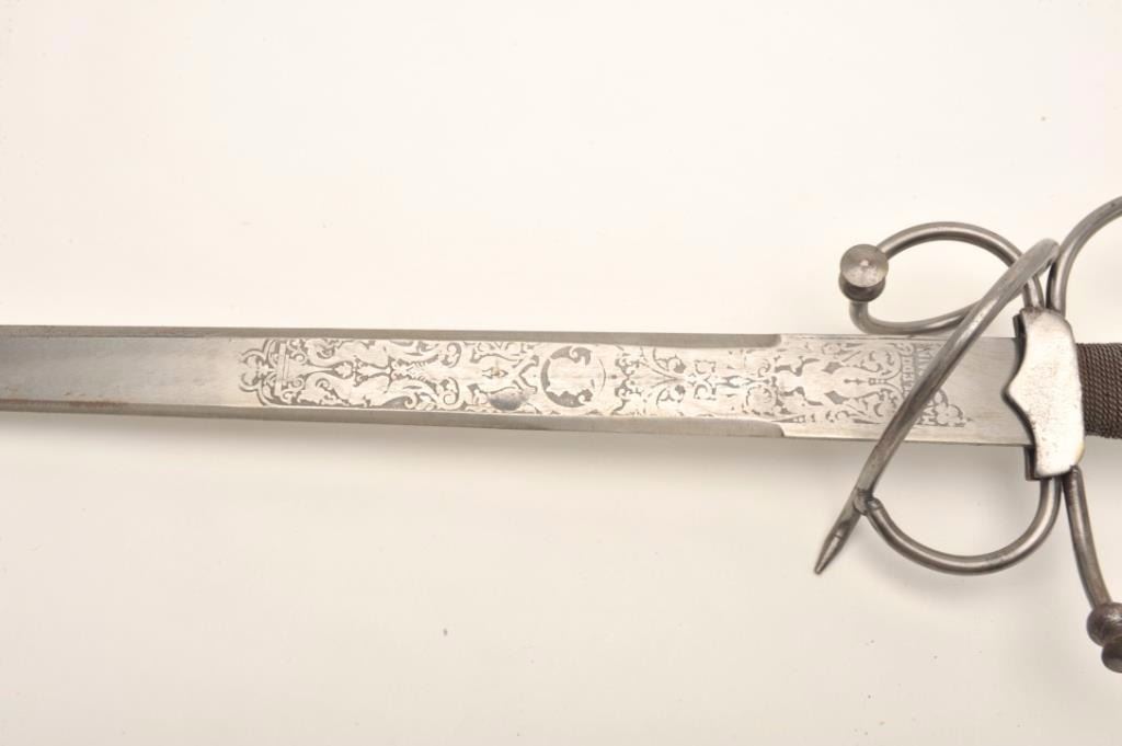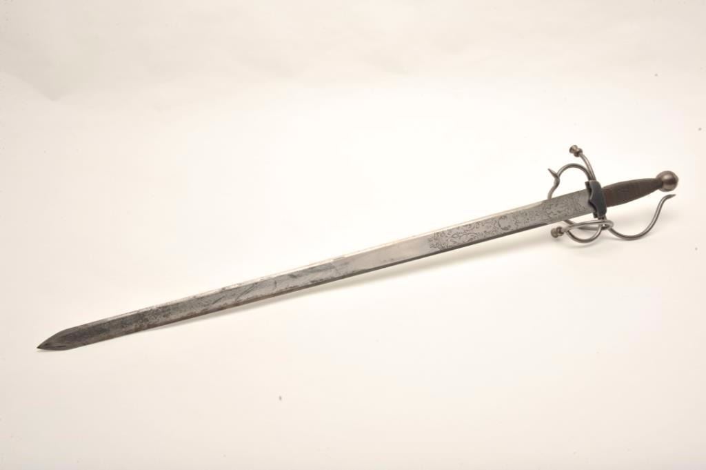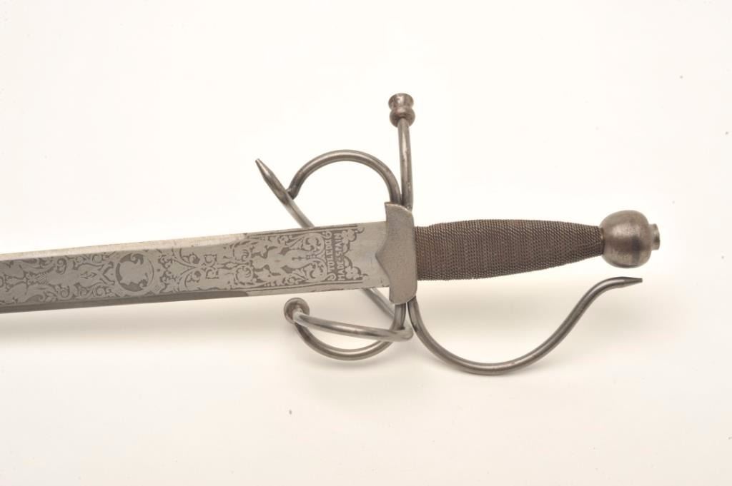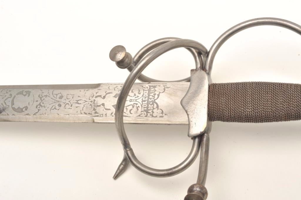 Spanish serpentine hilt sword, approximately 39” overall with a 33” Toledo-marked and decorated blade. Est.: $125-$250.