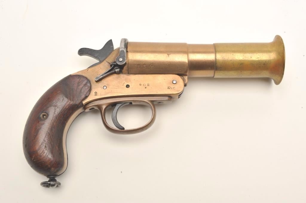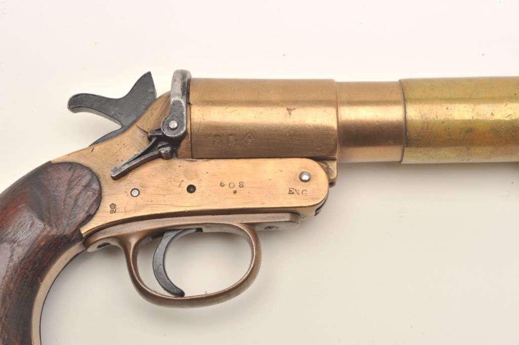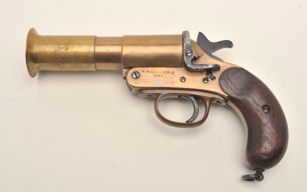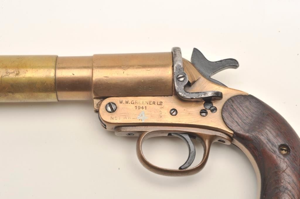 Lot 2027 British No. 2 MK III flare pistol by W.W. Greener, dated 1941, brass frame and barrel, wood grips,
