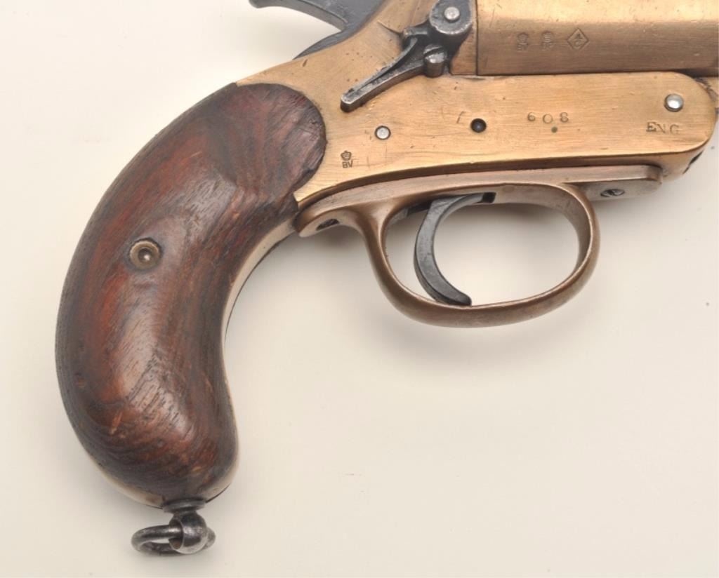British No. 2 MK III flare pistol by W.W. Greener, dated 1941, brass frame and barrel, wood grips, S/N 608, approximately 10” overall and in good condition with taffy colored patina to brass, good bore, strongaction and good grips. Est.: $200-$400.