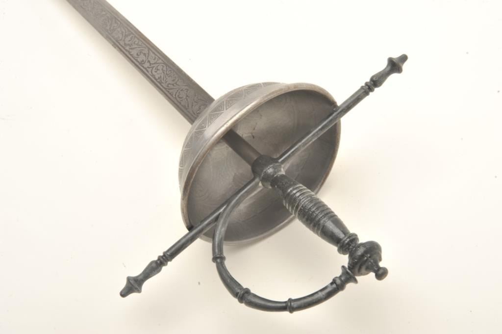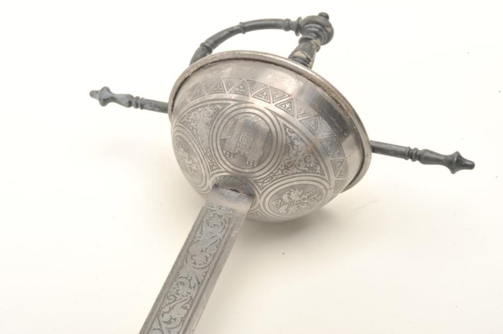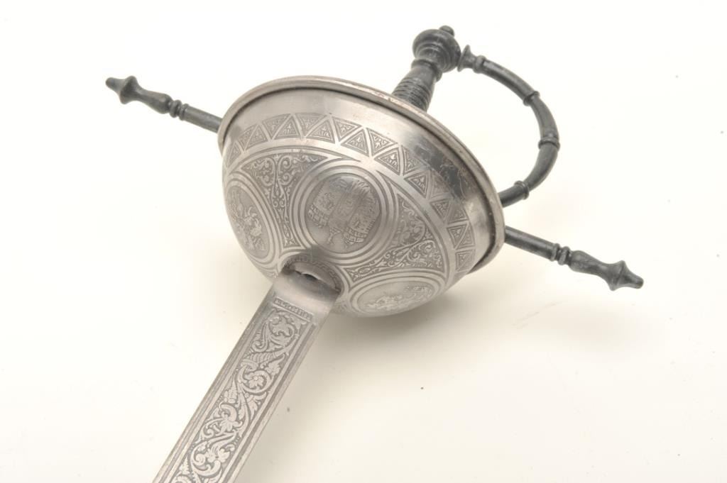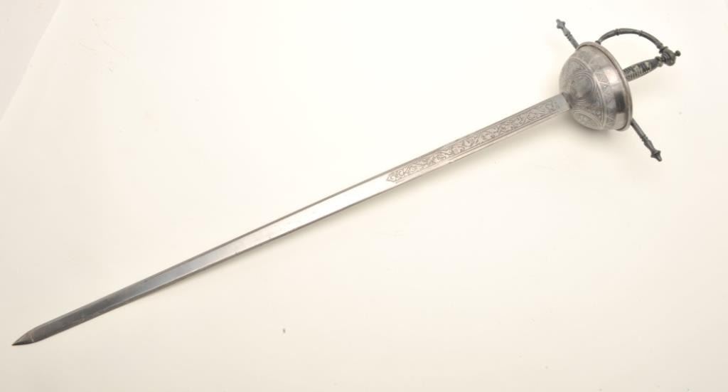 Spanish cup hilt sword, approximately 41” overall with a 34” Toledo-marked and decorated blade. Est.: $125-$250.