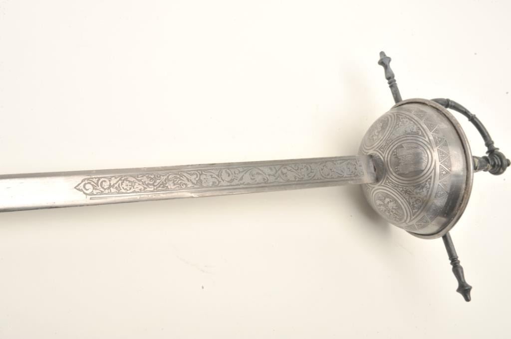 Lot 2029 Spanish cup hilt sword, approximately 41” overall with a 34” Toledo-marked and decorated blade.