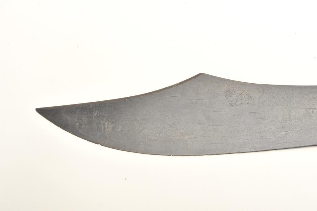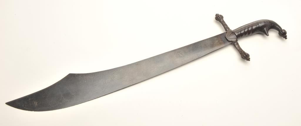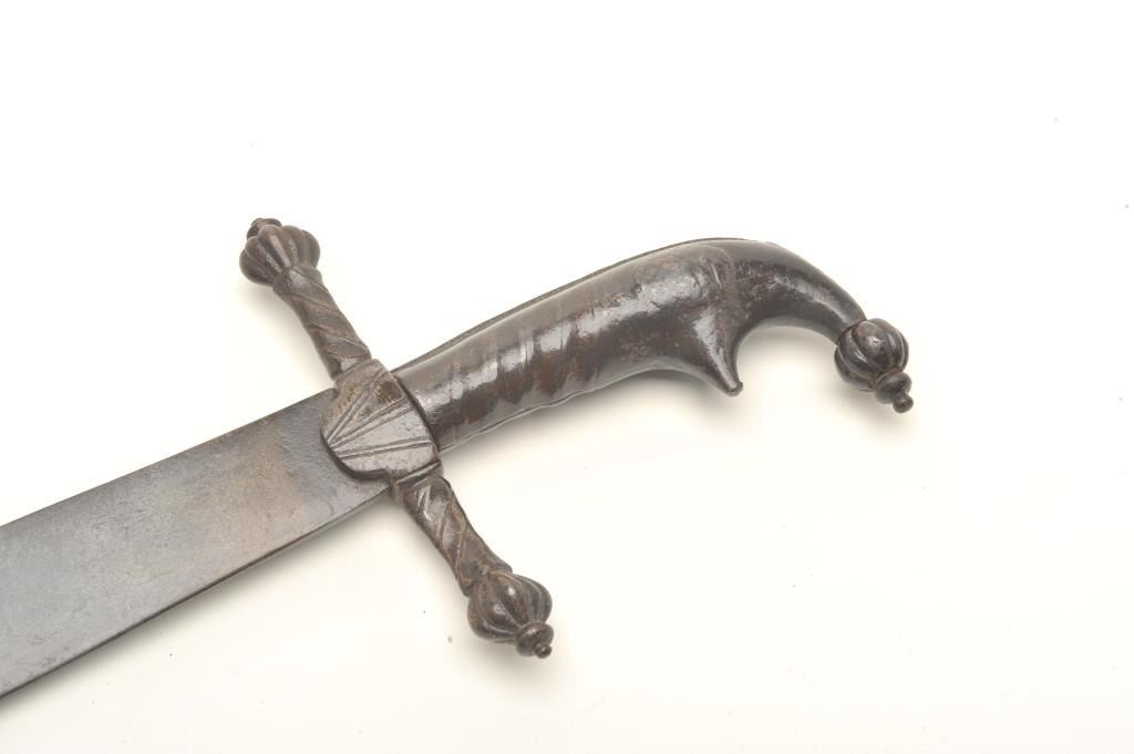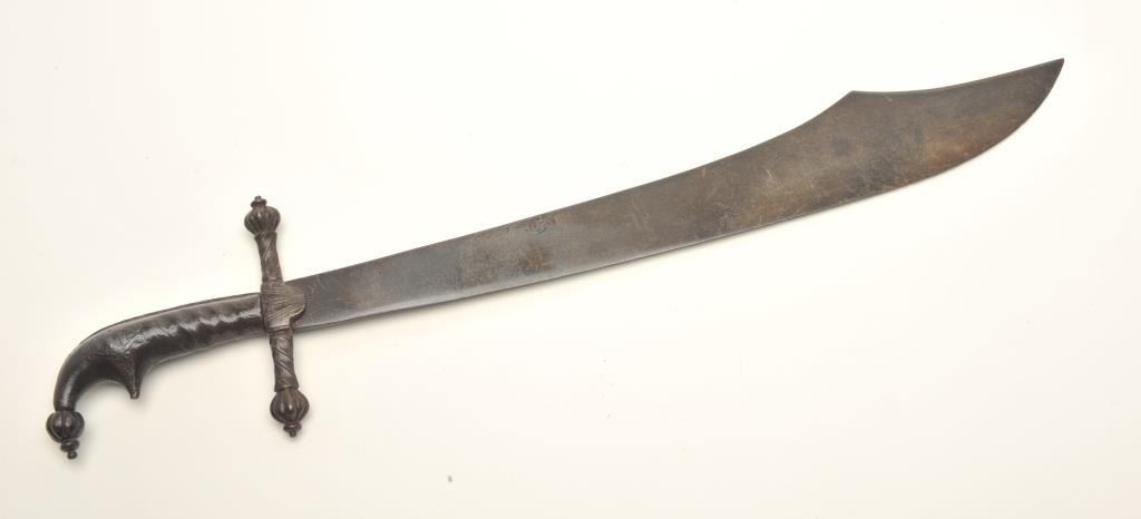 Unusual Mid-Eastern short sword, dark patina, approximately 27” overall with a 22” blade. Est.: $300-$600.