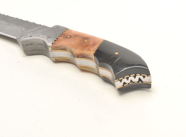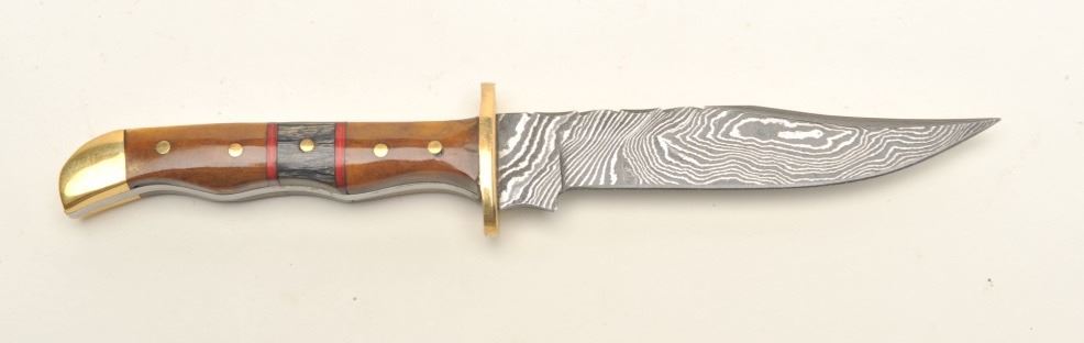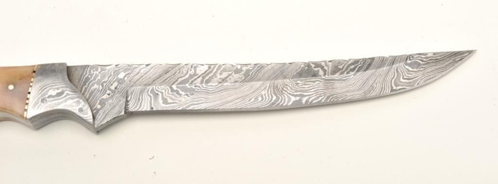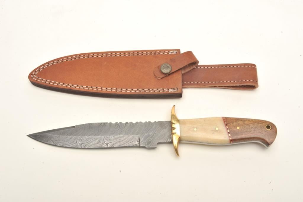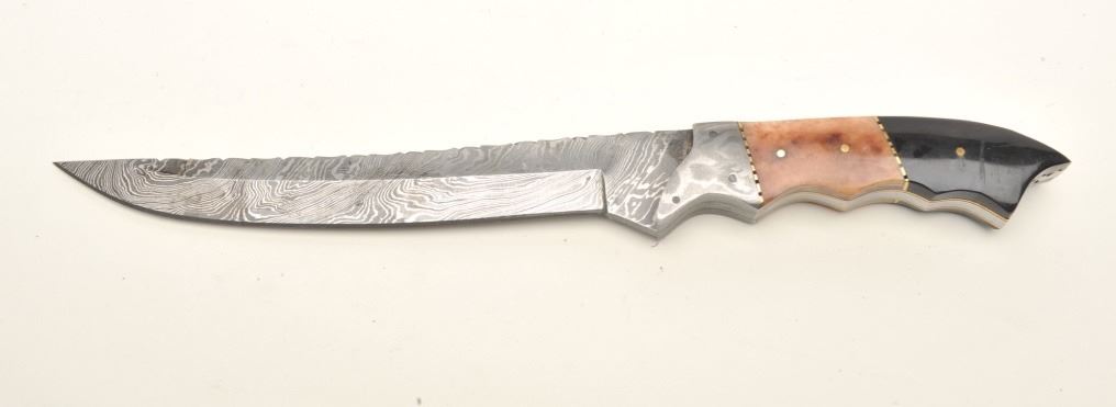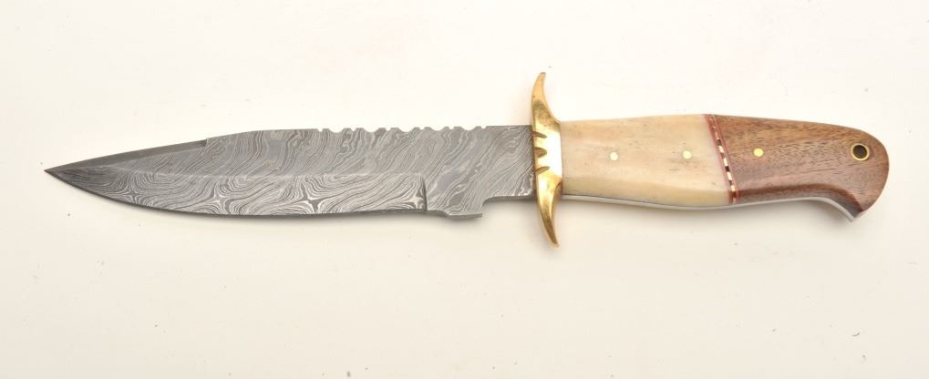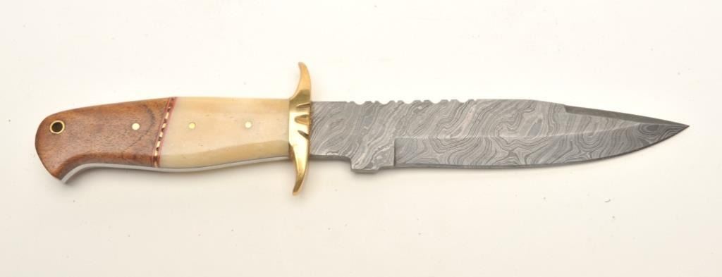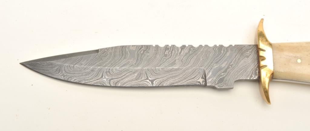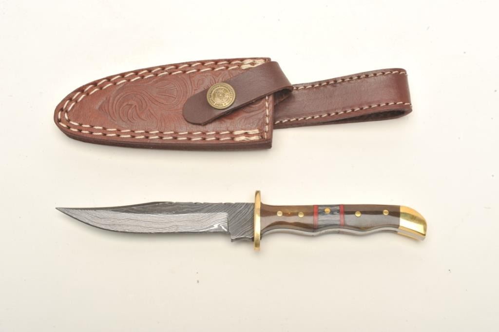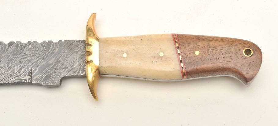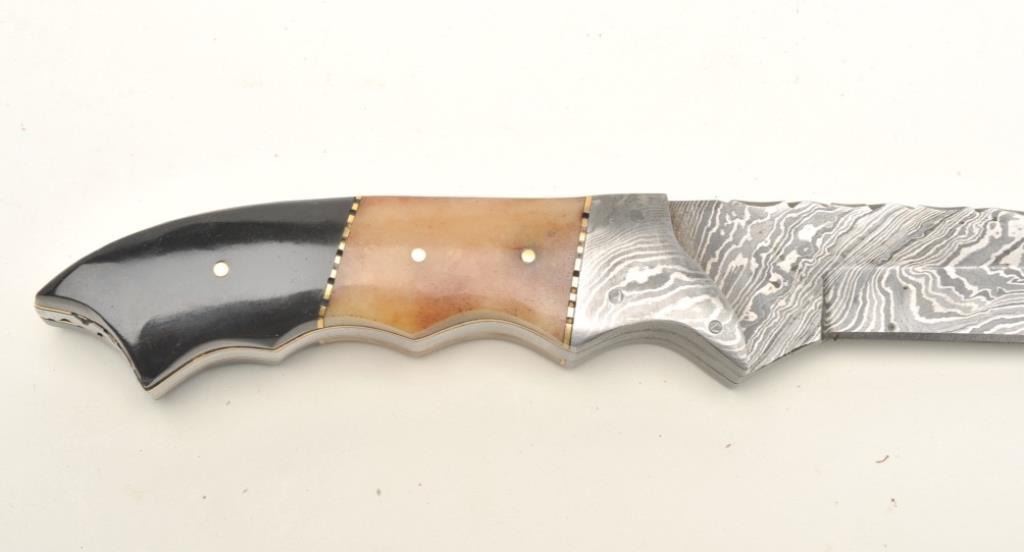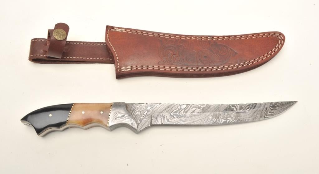 Lot of 3 custom belt knives with leather sheaths; first, an un-marked semi-sawback knife with 3-pinned custom grip of bone and wood, approximately 11.5” overall with a 7” blade in like new condition and accompanied by a leather sheath with “State of Oklahoma” snap; second, an un-marked long knife (approximately 13” overall with an 8” blade) with custom 6-pinned grip of metal, horn and bone in like new condition; accompanied by a tooled leather sheath with “State of Oklahoma” snap; also a small clip point knife, approximately 7.5” overall with a 4” blade and 5-pinned grip of bone and wood in overall excellent condition with a tooled leather sheath and “State of Oklahoma” snap. Est.: $500-$1,000.