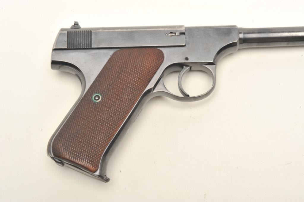 Colt Pre-Woodsman semi-auto pistol. .22 Long Rifle caliber, serial #49279. The pistol is in very good overall condition with a 6 ¾” barrel. The pistol retains the majority of its thinning blued finish with losses alongboth sides of the barrel and wear at the muzzle. The checkered wood grips are in good condition with some flattening of the checkering noted. The bore is good, the action crisp and markings are sharp on thisearly, desirable Colt. Est.: $750-$1,000. (C+R).