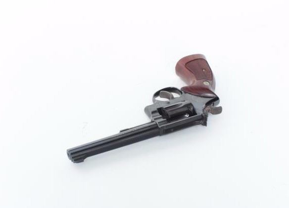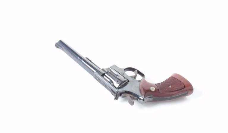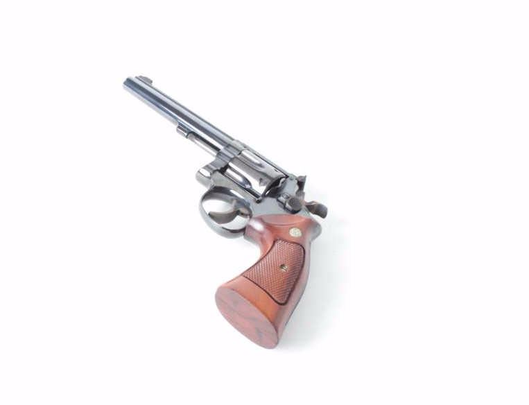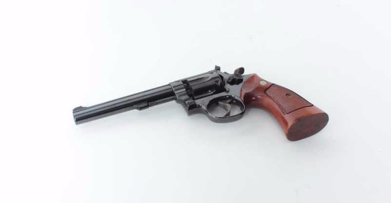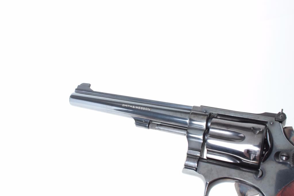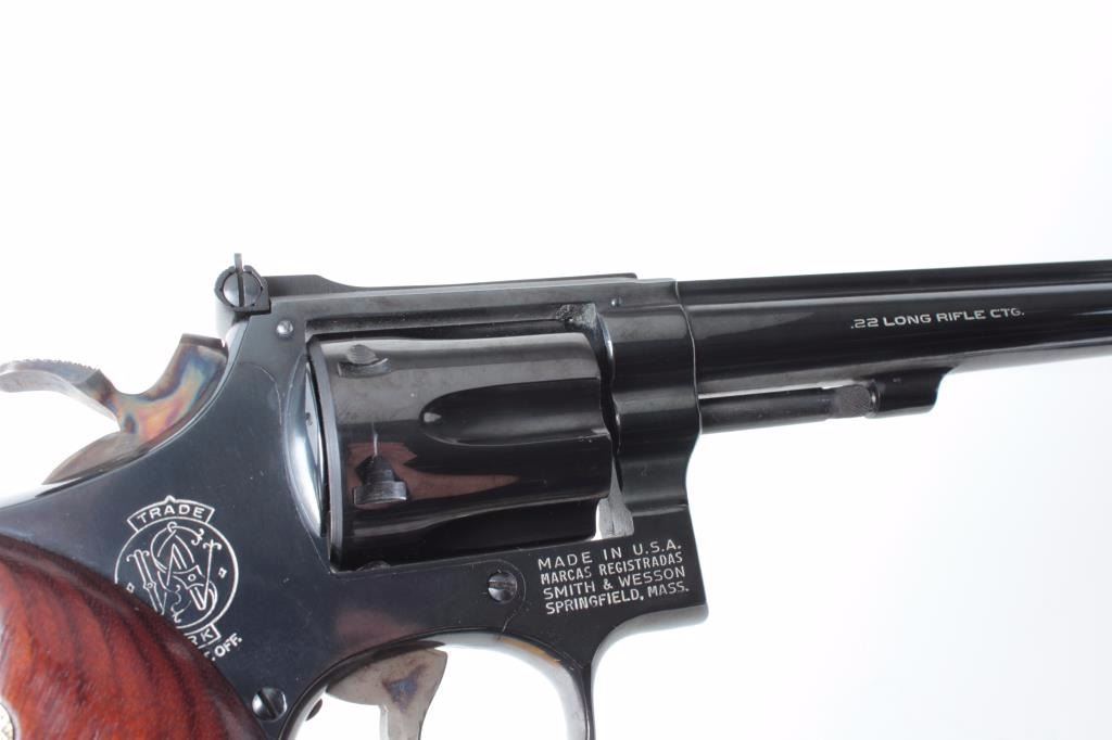 Lot 2039 Smith & Wesson Model 17-3 DA revolver, .22LR caliber, 6” barrel, blued finish, checkered wood meda
