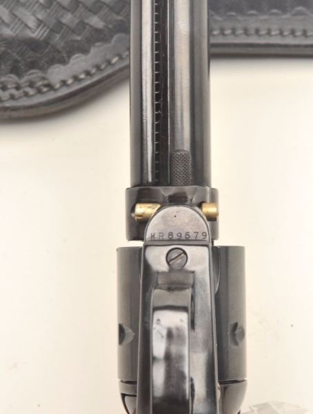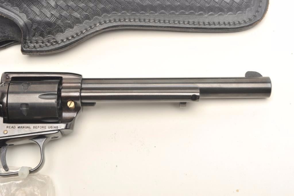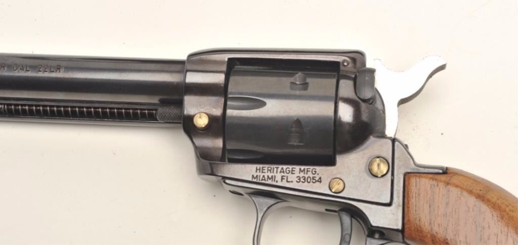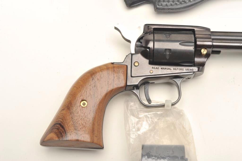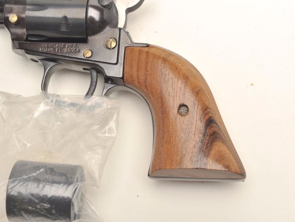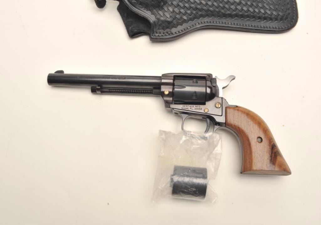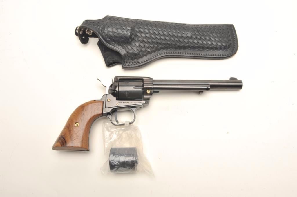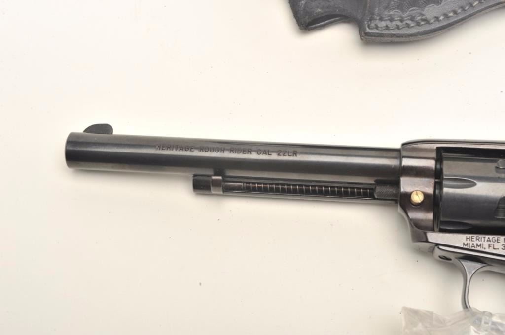 Heritage Rough Rider Model single action revolver, .22LR caliber, 6.5” barrel, blued finish, smooth wood grips, S/N HR89679, in overall fine condition with crisp action and markings, fine bore and grips; accompanied by an extra cylinder and a basket weave leather holster. (Modern/PPT). Est.: $75-$150.