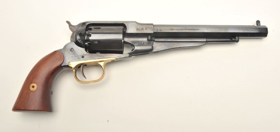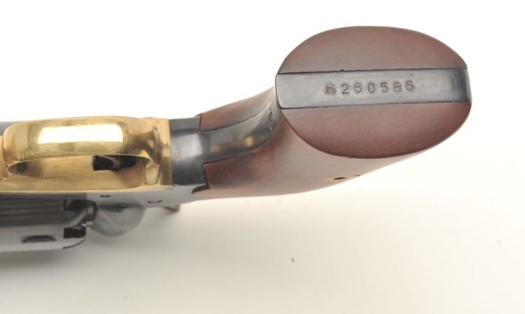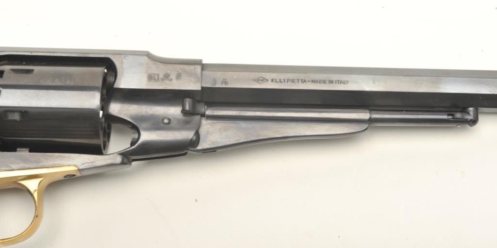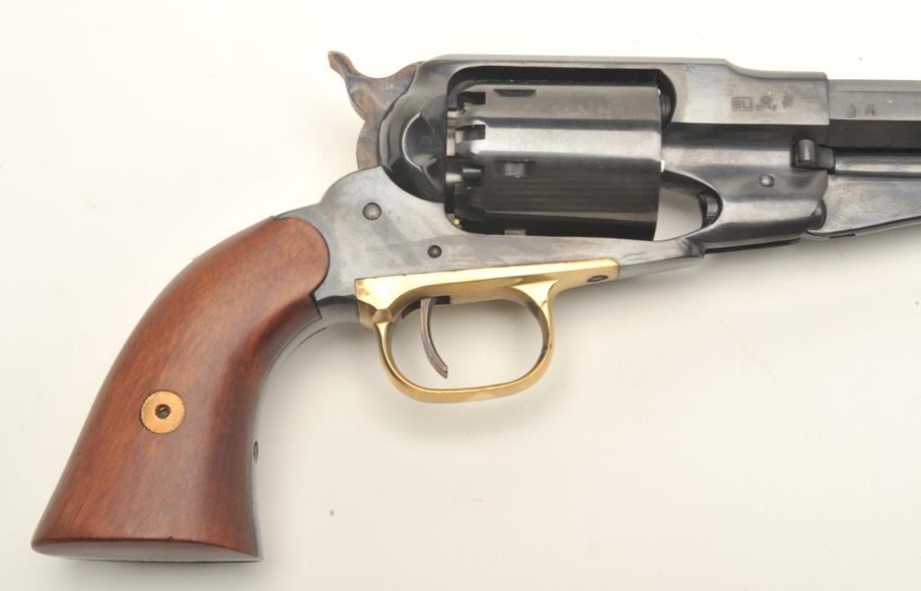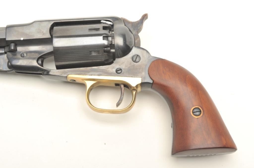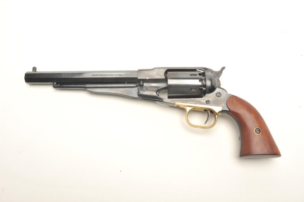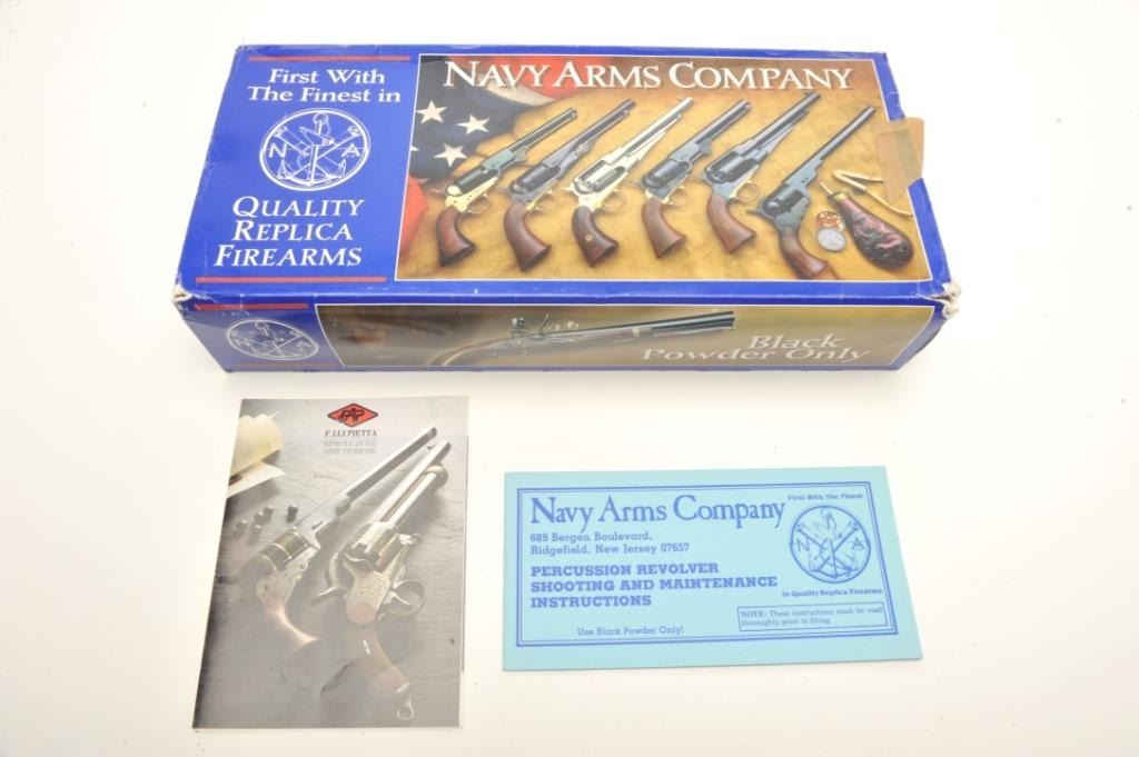 Navy Arms modern reproduction of a Remington Model 1858 percussion single action revolver, .44 caliber, 8” octagon barrel, blued finish, wood grips, S/N R260586, in like new condition in factory cardboard box withinserts and instructions manual. (percussion). Est.: $150-$300.