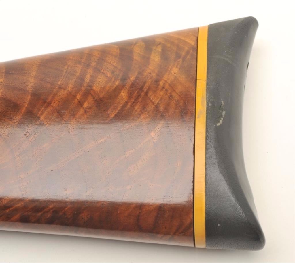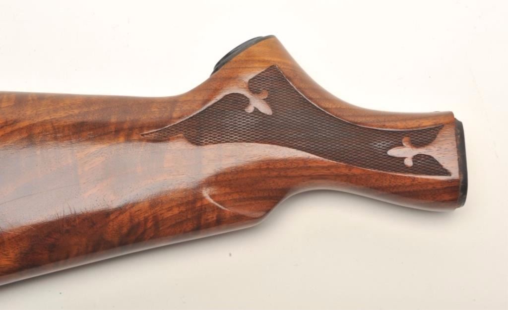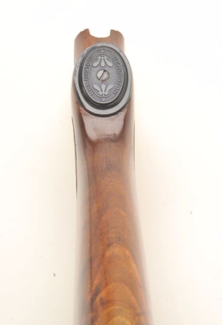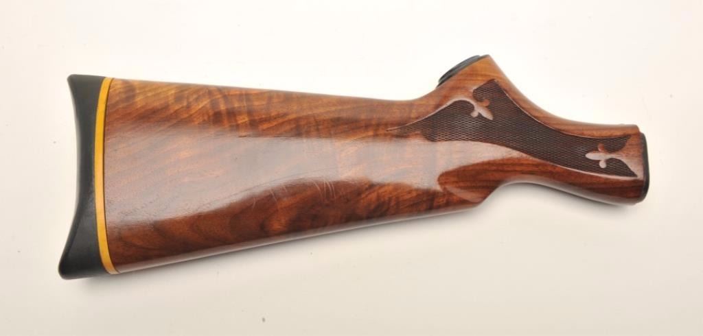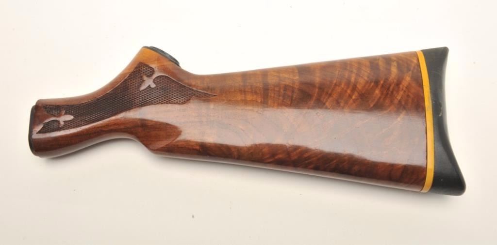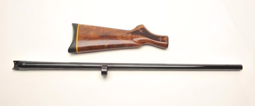 Remington Model 870 trap checkered wood stock and 12 gauge, 30” ventilated full choke barrel (butt stock and barrel only); stock is very good with beautiful graining and added Jenkins hard rubber butt pad, barrel is inoverall fine condition with original finish and fine bore. Est.: $100-$200.