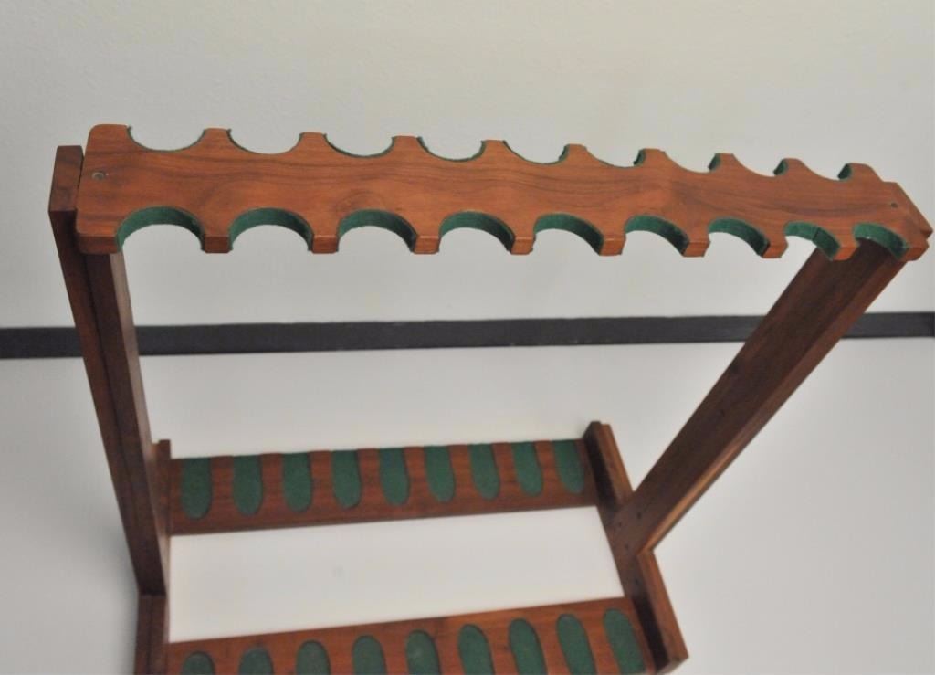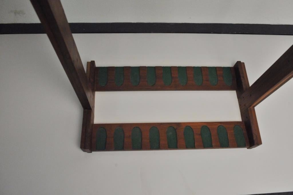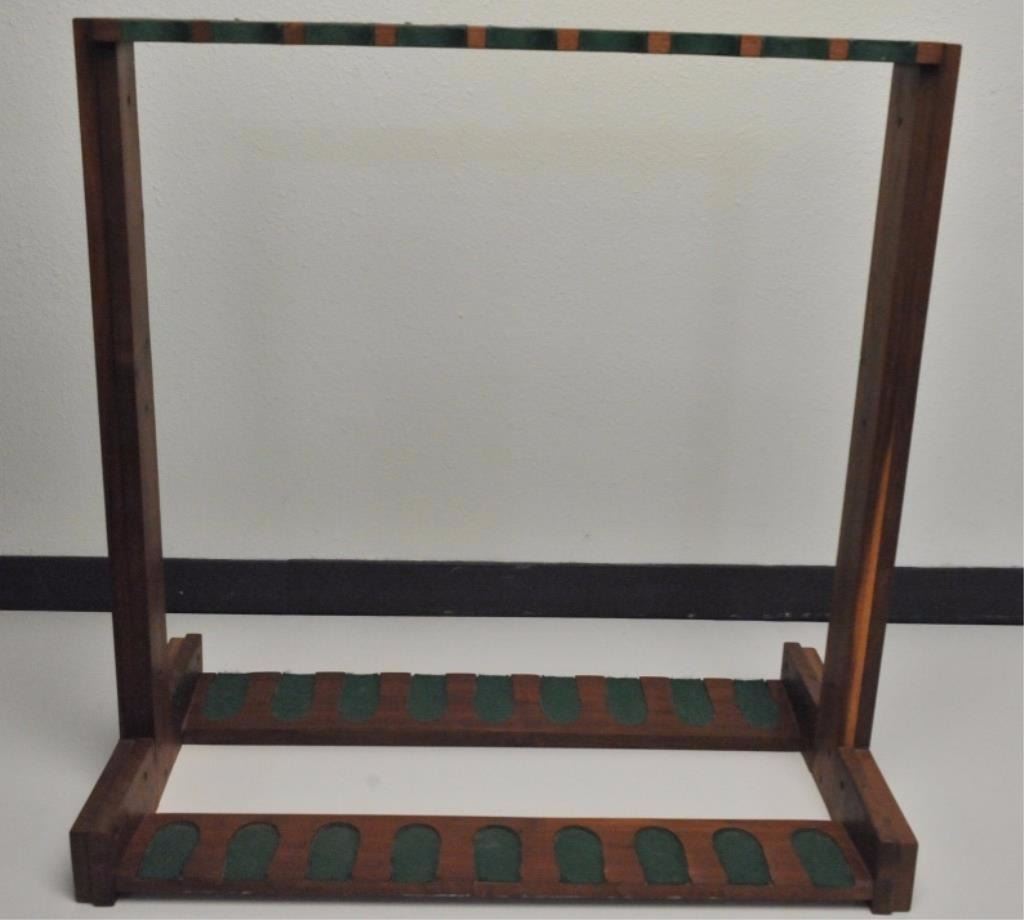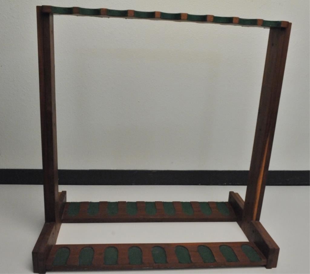 Small rifle rack with 18 positions to stand longarms; in walnut. Est.: $30-$60.