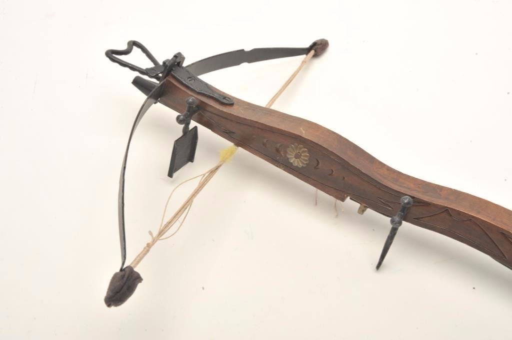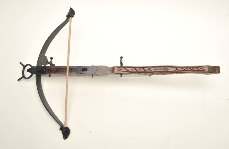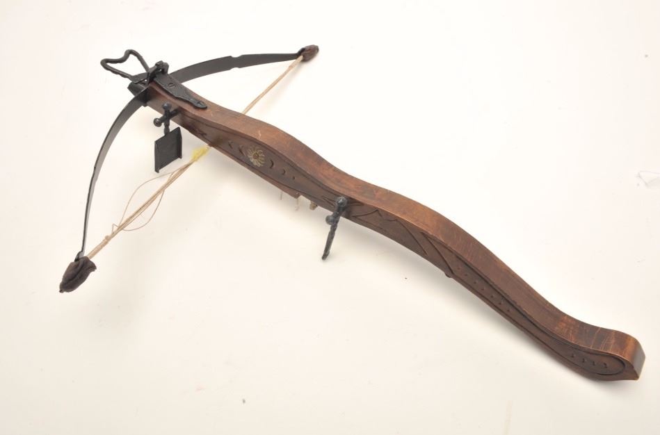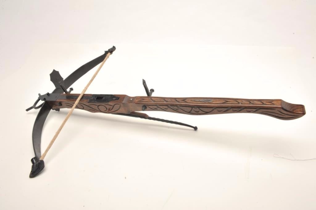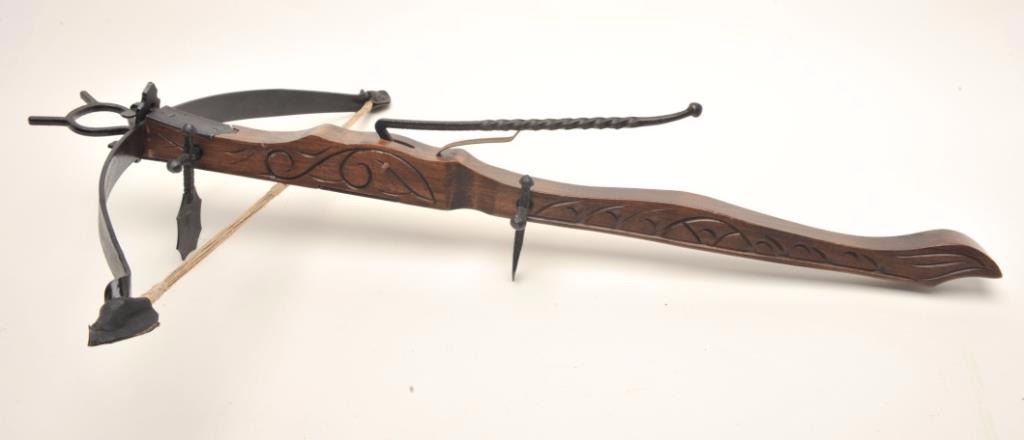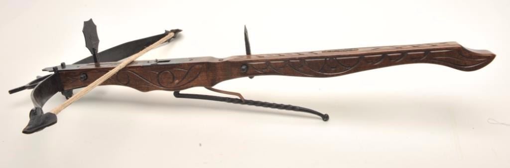 Lot of two reproduction crossbows. One crossbow is 34” in length and the other 21” in length. Both feature carved wood and metal ornamentation depicting period weapons. Nice wall hangers for the gun room or den. Est.: $25-$50.