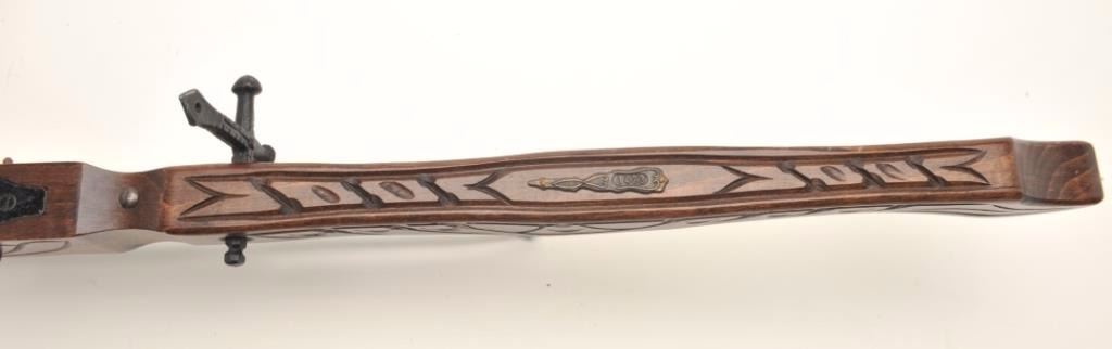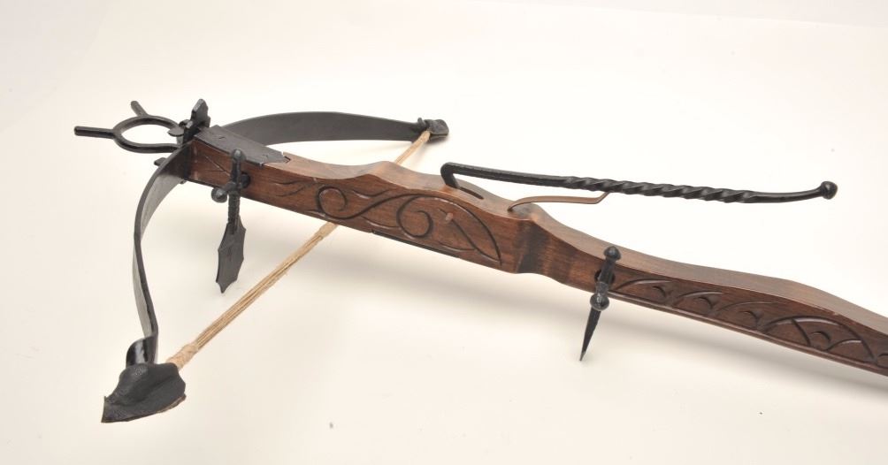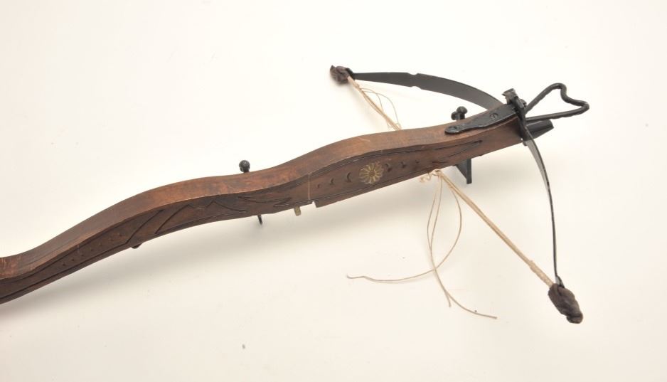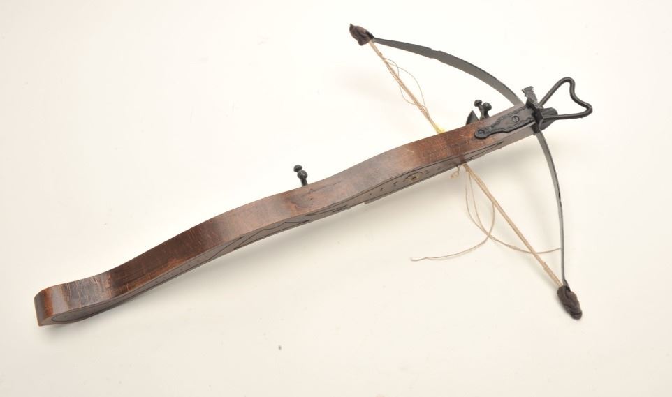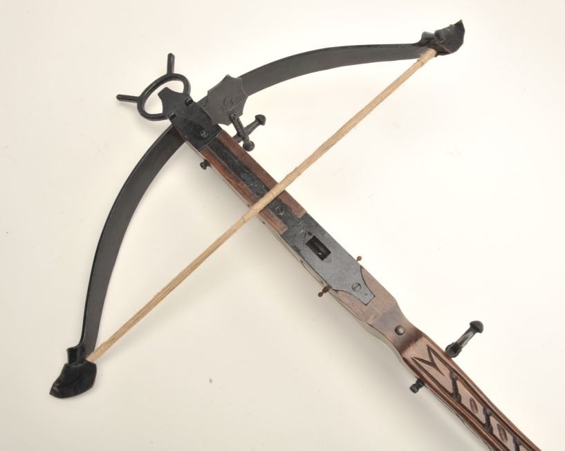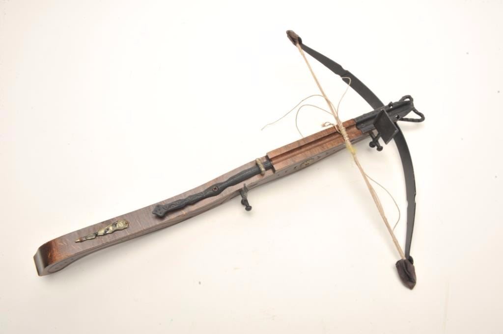 Lot of two reproduction crossbows. One crossbow is 34” in length and the other 21” in length. Both feature carved wood and metal ornamentation depicting period weapons. Nice wall hangers for the gun room or den. Est.: $25-$50.