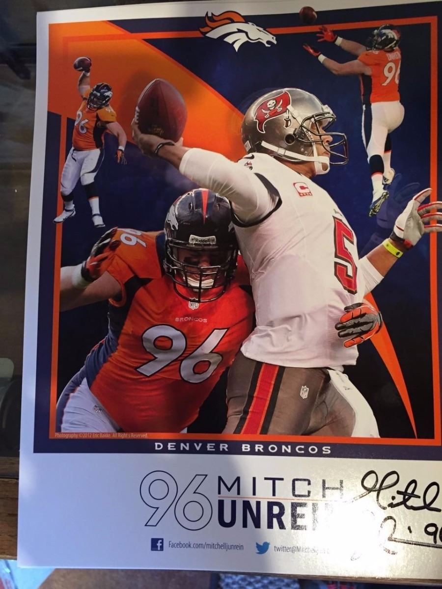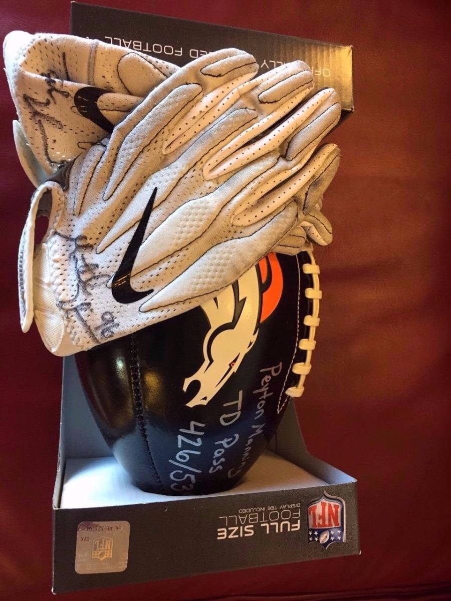 While playing for the Denver Broncos as a Defensive Lineman in 2012 against the Tampa Bay Buccaneers, Unrein lined up at the fullback position and proceeded to catch a touchdown pass from Peyton Manning. Unrein’s touchdown was #426 of Manning’s career and has the distinction of being just one of two touchdowns caught by a Defensive Lineman during Manning's record breaking 539 career passing touchdowns. Ball also comes with a pair of gloves worn in a game signed by Unrien and autograph card. Mitch Unrien played for the Denver Broncos