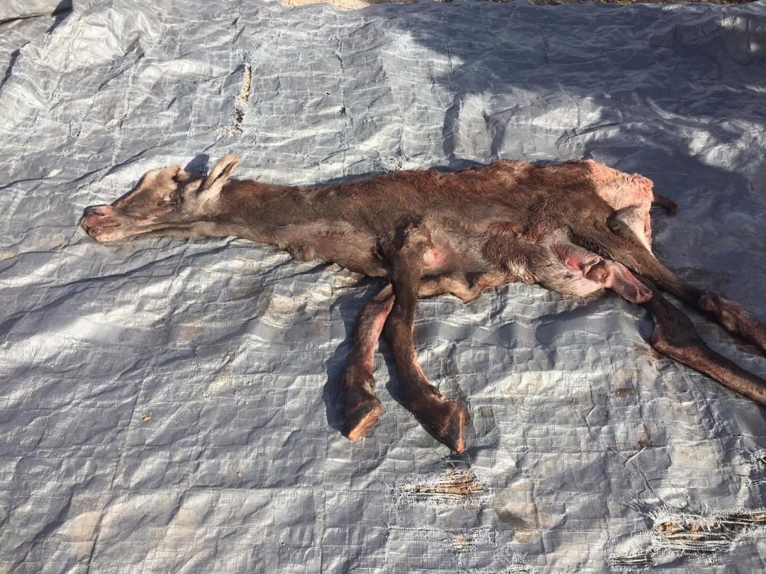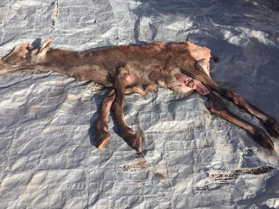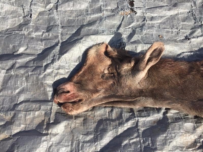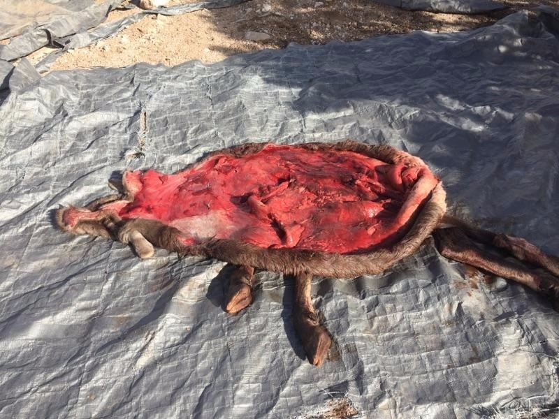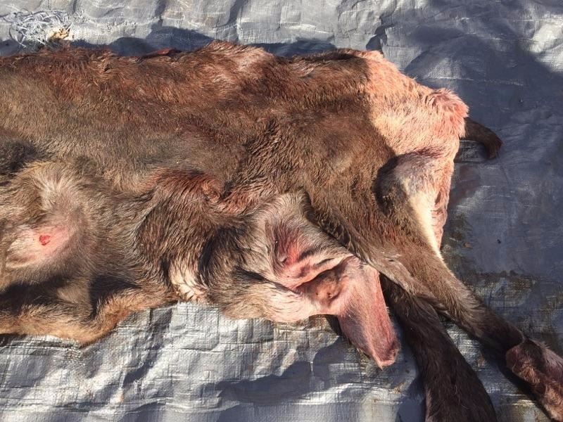 Donation: Skin is dorsal cut, for life-size mount, raw and frozen. Eye to nose measurement (A) is 7 5/8”, neck (B) is 18”, nose to tail (C) is 58”, and belly circumference (D) is 42”.