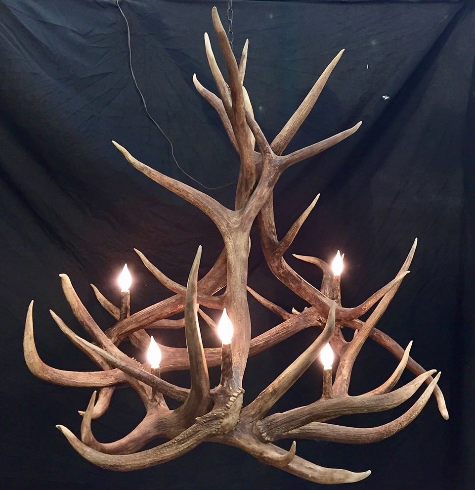 A beautiful hand-crafted masterpiece, brought to you by the skilled artisans at Legends Taxidermy IN Scottsville, Mi.! Made from 6 massive, 6-point plus real elk sheds to a dimension of 50 x 57 inches wide and 46 inches high. It has six candlesticks lights and a dark chain for hanging. This dramatic chandelier would make a great addition to trophy room, foyer, or lodge. The world-champion craftsman at Legends Taxidermy can manufacture a wide variety of custom décor and furnishings for your home or office. Online bidder is responsible for all shipping costs. We thank Legends Taxidermy for this 100% donation! VALUE: $4,900 | www.legendstaxidermy.com