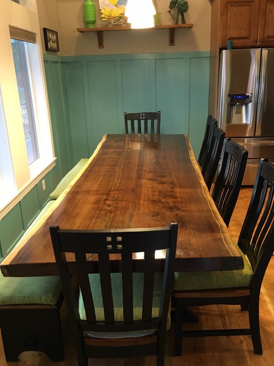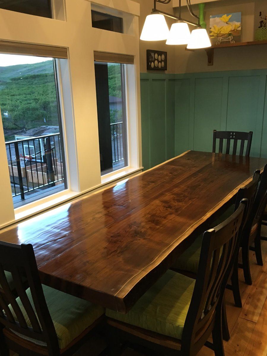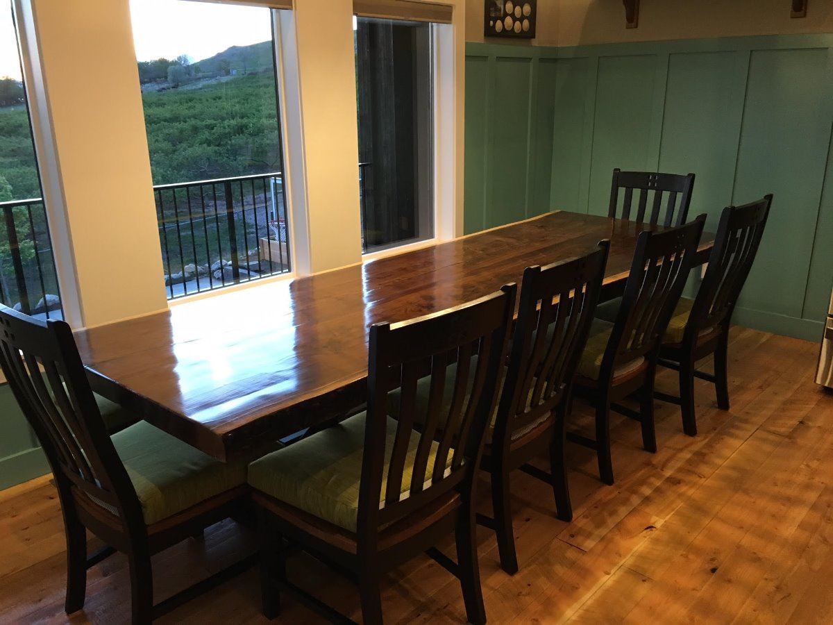 Handcrafted in the shadow of the Tetons, this live edge black walnut table is sure to make an improvement in any dining room. From the pure mass of the 3” thickness of the table to the clean lines of the base, this is truly a masterpiece for generations to enjoy. The seven-step sealing process puts the exclamation point on this piece!