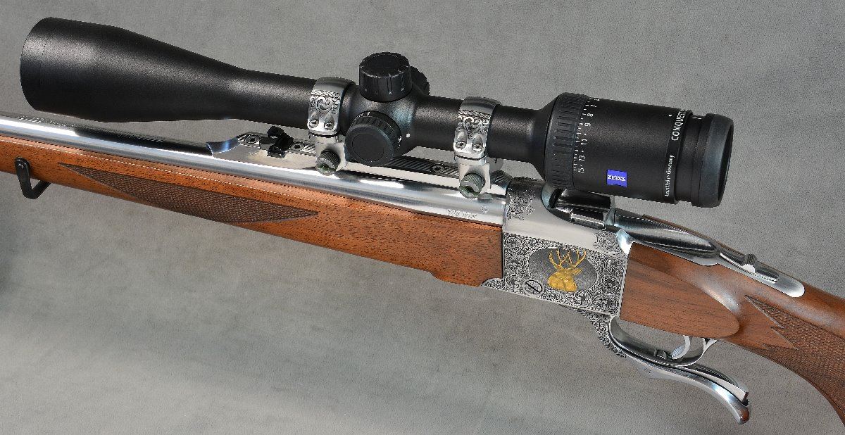 This beautiful Ruger model 1 stainless steel rifle sets the standard for the American-made, single shot rifle. It is chambered in .308 WSM and featuring an American Walnut Mannlicher-style stock. The receiver is entirely engraved by the superlative artists at Baron Engraving and features a mule deer theme. Gun comes complete with a Zeiss HD5 3-15x42 RZ 600 scope.