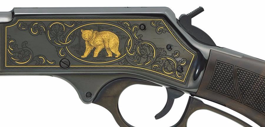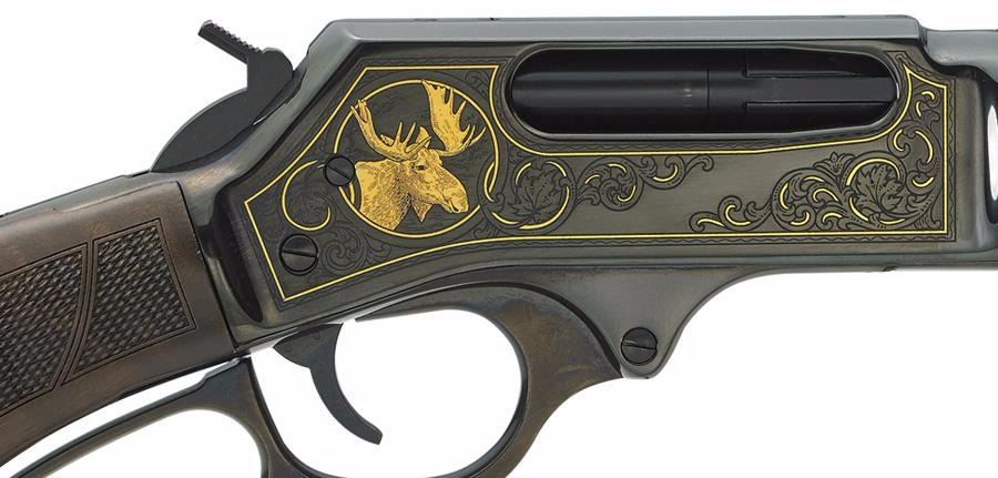Where do you look when you want a classic lever action with style that sets it apart from the rest, but not enough shine to risk spooking game? Easy -- our steel-framed Wildlife edition in one of America’s longest-lived hunting calibers, the venerable .45-70. This steel-framed model acknowledges a long history of hunting, and the lever action’s well-earned place in it for over 150 years. Subdued, with blued steel frame and furniture, it's also light in weight for long days on foot through dense brush and high mountain terrain. The H010WL in .45-70 is a trim powerhouse with its 18.43” barrel under semi-buckhorn rear and tall brass bead front sights. A checkered pistolgrip walnut stock, sling swivel studs, and ventilated black rubber recoil pad fill out the package. Engraving pattern features a 24K gold relief profile of a bear adorning the left side of the blued frame inside gold-accented scroll, line, and braided borders, with a gold relief image of a moose head on the right side. Built to bring home the bacon (or whatever your hunt takes you after), this special steel-framed Wildlife model is a cut above, and a point of pride. Overall Length: 39”, Weight 7.08 lbs., Capacity 4 rds.