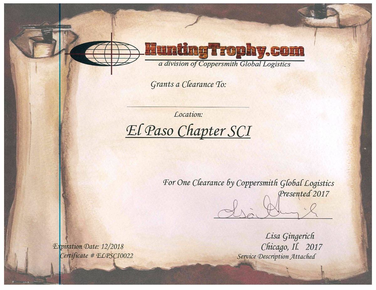 Trophy Clearance Certificates for 2 Hunters - Coppersmith Global Logistics has donated gift certificates for trophy customs entry for two hunters, to be shared. Includes Customs Entry Service Fee, Fish & Wildlife Entry Service Fee, Cargo Import Service Charge, Messenger Fee, Airport Transfer and Coppersmith Warehouse Handling Fee. Total Certificate Value - $425.00 x 2 = $850.00. Excludes: Additional hunters, USDA & FWS Exam, CDC Permit, US FWS Premium (Cites) Inspection fees.