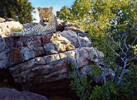 Joshua Spies, famed wildlife artist and 2011 SCI Conservation Artist of the Year, has produced this beautiful painting of a leopard overlooking the terrain below him. It is this artist’s bold depiction of the stealthy leopard on a prominent point of land that completed SCI’s Big Five themed Conservation Artist of the Year Program. This work of art has become a highly sought after collectible that can normally only be found on the secondary market. This beautiful but primal giclee print is number XX of 100.
