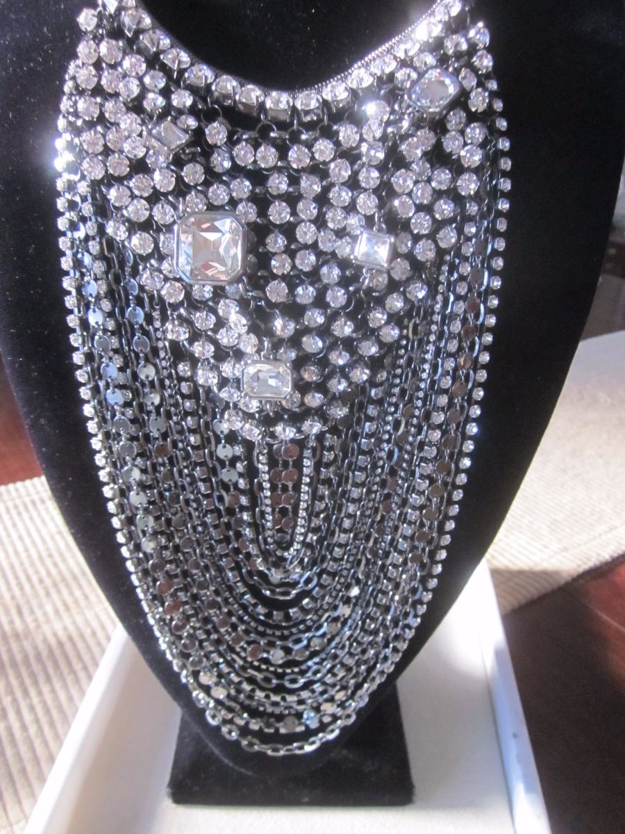 A bold, beautiful, limited edition necklace and earring set features thirteen rows of brilliant cut faceted stones interspersed with five brilliant cut square faceted stones with eleven descending rows of stones and delicate gunmetal shapes that add even more sparkle. Add dramatic earrings with a brilliant cut center stone surrounded by eight teardrop stones and delicate black feathers. Gunmetal chain link with large lobster claw closure and a 4” extender with a faceted stone. This is a statement jewelry ensemble that creates its own excitement!