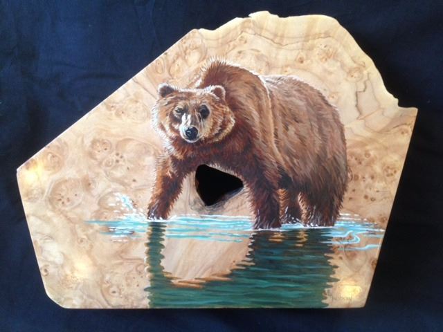 "Griz" is an original oil painting on a beautifully unique piece of California buckeye burl, approximately 9"x12". Buckeye is in the maple family and this burl exhibits a splendid example of the "birds eye" features they are known for.