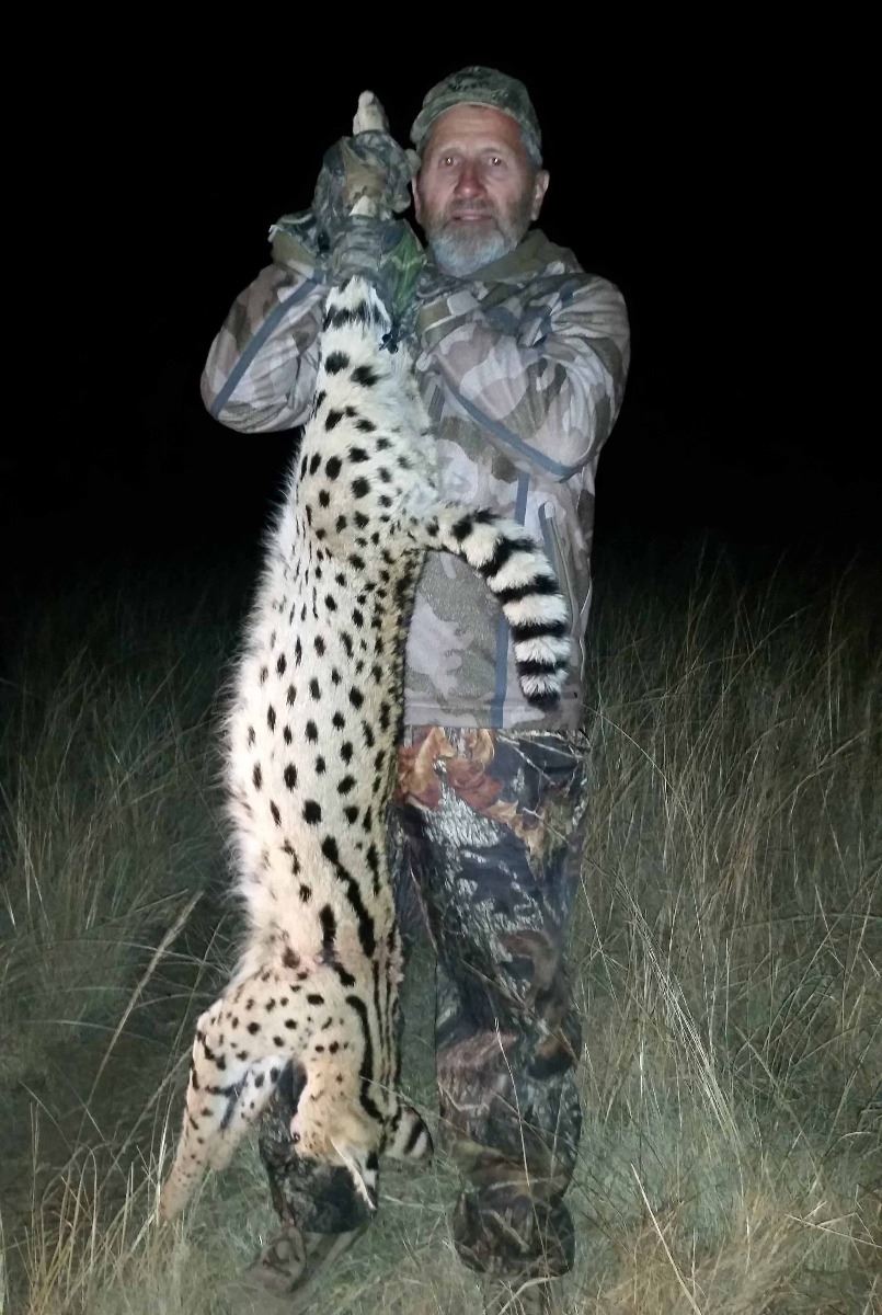 The trip is for 6 days of hunting (1x1) for each of 2 hunters, with the use of hounds. The cat hunting usually takes place first thing in the morning when the scent is best captured by the hounds. Plains game hunting can take place through the rest of the day, and usually hunting for the cats can again take place into the evening darkness with lamps.