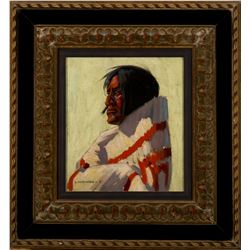 Lon Megargee has the classic turn of the twentieth century western artist pedigree. Born into a wealthy Philadelphia family, he ran away from home to become a cowboy, and did, roping and riding in Arizona. At some point, the art bug bit him and he went back East to study, only to head back West to paint. In 1909 he found work as an art director at Paramount Studios in Hollywood and did that for a number of years before settling in Arizona to pursue his art. Megargee worked for the Santa Fe Railroad, did illustrations for books and periodicals, and painted murals. He seemed to be able to adapt his style to his subject, but his portraits of Native Americans all share a similar boldness of line and color while finding poignancy and introspection in his subjects.
