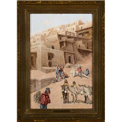 An important Cincinnati artist, John Hauser studied in Munich, Dusseldorf and Paris, developing a kind of thoughtful yet lush realistic style that suited his interest in Indian portraiture and scenes of Native American life. Often overshadowed by fellow Cincinnati native Henry Farny, Hauser more than holds his own. Moreover, Hauser is the genuine article: he made yearly trips West and in 1901 he was adopted into the Sioux nation and given the name “Straight White Shield.” Toilers of the Pueblo offers a glimpse into the daily lives of Pueblo Indians and a wonderful, almost vertiginous look at their magnificent, ancient architecture.