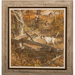 Like many of his contemporaries, Robert Abbett began his career in commercial art, providing illustrations for paperbacks, film posters and advertisements. In 1970, Abbett left the hum of New York for rural Connecticut and heeded the call of the deep woods and rolling waters that abound there. Soon, Abbett left commercial art behind as he embarked on a tremendous career painting fly fishing and, especially, bird hunting scenes, such as Pointer with Bobwhite Quail. You have to hope either that the artist is hunting or that there’s a hunter just off the edge of the canvas. Because this would be a waste of a great covey rise otherwise. The setting is breathtaking, autumnal, at the edge of the woods that run up to the field and barn in the distance. The dog has done its part. If those birds get away, you will likely be the recipient of a look of utter canine disgust.