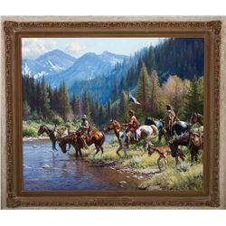 Of New Wealth for the Blackfeet, Martin Grelle writes: “The flag is a Fur Trade era flag carried by employees of the American Fur Company. The Blackfeet have the flag, but have also acquired the hat (typical of the fur trade), a trade gun, a small red trade blanket, a mule (with its pack), a packhorse (with its pack AND its colt). And quite likely a couple of the horses they’re riding as well, or at least some bridles. Maybe they traded for these things, maybe not... Odds probably favor ‘not’.” But what did happen to the mountain man? Was he killed by these Indians, as Grelle suggests? History tells us that mountain men and trappers could succumb to any of a number of things. Exposure. Disease. The madness that shadows loneliness. Did he just drop everything and head back, out, back East, back home? One thing is certain—it’s a windfall for these men, one that will stand them in good stead when they return to their camp. The day, the brilliance of the weather, the glory of the landscape, straightens out the question mark at the end of the unanswered and, ultimately, unanswerable question: what happened to the mountain man?