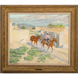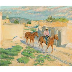 Born in Germany, Walter Ufer emigrated to Kentucky as a boy. His father, a master engraver and gunsmith, apprenticed young Walter to a lithography firm. With his parents’ support, Ufer traveled to Europe and completed his studies in Dresden. While there, Ufer became friends with Joseph Sharp and Ernest Blumenschein, two crucial colleagues in Ufer’s career. When he returned to the States, Ufer settled in Chicago, where Mayor Carter Harrison became the artist’s first patron. Though Ufer, an avowed socialist, bristled at Harrison’s patronage, it was Harrison who sent Ufer to Taos, where he met up again with Sharp and Blumenschein and found his subject—the Indians of the New Mexico Pueblos. Ufer also took Harrison’s advice and devoted himself to painting the Indian “as he is,” without the overtones of romanticism that characterized Native American depiction. Ufer was eagerly accepted into the Taos Society of Artists. His legacy of socially significant paintings, combining strong composition, elegant impasto work and vibrant light and color make him one of the most striking figures in early 20th century American art.