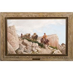 In addition to his masterful historical works, John Clymer also painted wildlife and high country hunting scenes. In Sheep Hunters, the pack train of men, horses and mules works its way down the trail. Behind them are the jagged, snow-capped peaks, bighorn habitat. It’s been a good hunt. A trophy, full curl head, sheepskin, and meat, are strapped to the first mule. Ahead of them, the comforts of camp and the story await their arrival. There’ll be a good time around a good fire tonight.