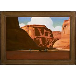 Delano’s deserts resonate with biblical imagery. The Navajo, via his brushes and palette, seem like first people, or chosen people. In Delano’s mind, the Navajo are close to Nature and therefore close to God in their simplicity and in their aversion to the modern. Their canyons are otherworldly, detached paradises, beautiful in—or because of their austerity. As opposed to the expulsion from Eden or the wanderings of the people of Moses in the desert, the Navajo in Canyon Exodus, dwarfed by the divinity of the red rocks and blessed by the shaft of sun that points the way, seem simply to be moving from one camp to another, from one plot in Eden to another. A rider leads, a wagon follows, a shepherdess and flock trail behind. This is a leisurely migration, born out of abundance.