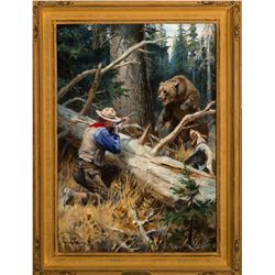 After a period of study with Howard Pyle, Philip Goodwin made his career illustrating classic works like Theodore Roosevelt’s African Game Trails and Jack London’s Call of the Wild. Goodwin—a New York native—spent summers in the West, camping, hunting, fishing, and gathering material for his inimitable oils depicting the romance of sport. Along the way, he became close friends with Charles Russell and Carl Rungius. Goodwin’s images made their way into the American sporting unconscious through periodicals, advertising (especially for Remington Arms and Winchester) and calendars—the 20th century American artist’s bread and butter. Dangerous Sport is a tightly composed, strongly triangular predicament picture depicting a hunter, dog, and grizzly bear charging and rearing up on two legs. In addition to the triangle created by the man, dog, and bear, the fallen tree creates separate triangles—one each confining the dog, the hunter, and the bear. It is as if the hunter represents civilization, the dog domestication, and the bear the wilderness. Which will prevail is? Goodwin loved the wild in the wilderness, and it isn’t always clear whose side he’s on. This ambiguity is what makes his work endure.