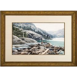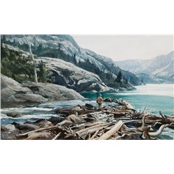 Descending in a direct aesthetic line from masters like Winslow Homer, A. B. Frost, and Frank Benson, Ogden Pleissner is arguably the most important 20th century interpreter of the American sporting scene, especially in the medium of watercolor. Because Pleissner considered himself first and foremost a painter of landscapes, his sportsmen are always in and of the scene and season, and his paintings are undiminished with time. Ross Lake, in the Wind River Range in Wyoming, now part of the Gros Ventre Wilderness was one of Pleissner’s favorite western subjects, and places to fish. The Outlet depicted in the painting, which I believe connects Ross Lake to Upper Ross Lake, would be a natural spot for a trout fisherman: flowing water creating pools and eddies and plenty of jammed logs for trout to hide under. You could make a day of it there, and then some.