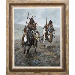 Howard Terpning, the most celebrated contemporary artist of the American West, was born in Oak Park, Illinois and studied at the Chicago Academy and the American Academy of Art. He made his name as a commercial artist in Chicago and New York, and his images were featured in a variety of periodicals and in campaigns for numerous products. His posters for classic Hollywood movies, including The Sound of Music and Dr. Zhivago have become part of American film culture. When Winchester Arms hired him, Terpning rediscovered his old, first love of Native Americans and the West and he threw himself into the history and culture of the period. The Plains Indians, in particular, fascinated him and in 1975, he gave up his lucrative career in commercial art and headed West. Two years later, he settled in Tucson and answered his true vocation as a painter in the grand tradition of Catlin and Bodmer, Remington and Russell. Like them, Terpning combines superb draftsmanship, authenticity as regards the material cultures of the Plains peoples, and a storyteller’s gift. Not strictly realistic, Terpning’s technique—his way of containing a beautifully drawn figure within swirls and slashes of colors— illuminates the action and alludes to inner strength, memory, and turmoil, and, thus, externalizes the drama. In Blackfoot Horsebacks, the rise and fall of the land and the turbulence of the sky suggests imminent conflict. The two layers of hills tilt in opposite directions on the canvas, as if they are shifting, and the low, darkening sky indicates a coming storm. On the gallop, the two warriors steel themselves for action.