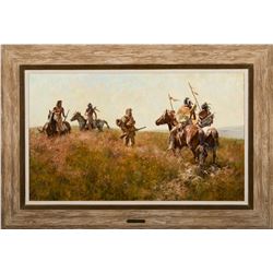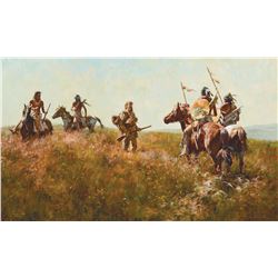 Painted in a period when Terpning was keenly interested in the interactions and collisions between mountain men and Native Americans in the early west, Slim Chance divides the space into two horizontals and circles the action around a lone, centered, surrounded trapper—on foot—who will have a small window of opportunity to explain his presence and business here to four mounted warriors. With luck, he knows something of the language. Terpning puts us at just enough of a distance to appreciate the trapper’s precarious aloneness and from this angle, it seems that the hill might just swallow the man, as, indeed, it might.