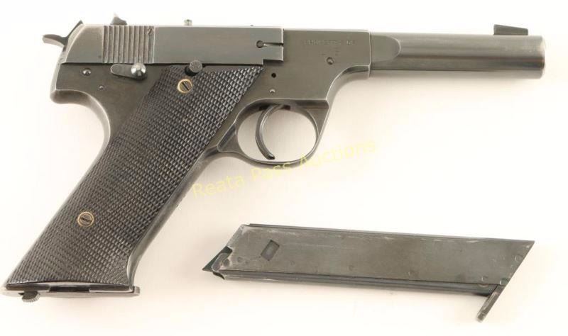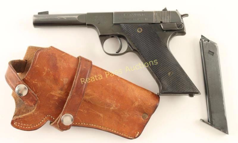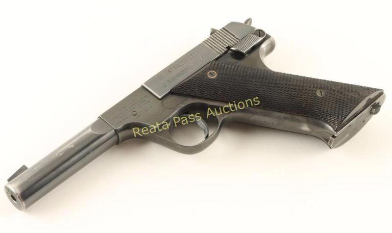 'PROPERTY OF U.S.' Marked single action semi-automatic target pistol chambered in .22 Long Rifle. Features a high polish blued finish, 4.5" heavy barrel stamped "PROPERTY OF U.S.A.", patridge front sight, dovetailed rear window sight, slide hold-open lever, thumb safety, 10 round magazine, "PROPERTY OF U.S." marked frame, serrated trigger, checkered hammer spur and two-piece checkered black plastic grips. Includes a spare magazine and a Smith & Wesson brown leather belt loop holster stamped "EFP 1989." The pistol exhibits approximately 84% of it's original blued finish showing holster wear, light oxidation on the frame and wear on the grip straps. Action is sound, bore is excellent and plastic grips are near fine. Condition is very good+. ***Modern Firearm***