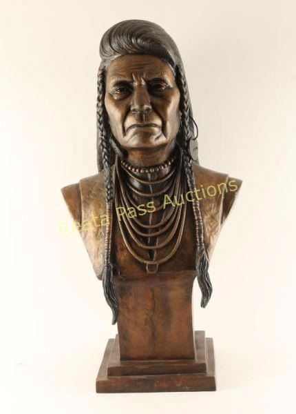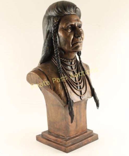 Bust of famous Nez Perce Chief Joseph. Great attention to detail with a golden patina. Measures 28"x12 1/2"x9".