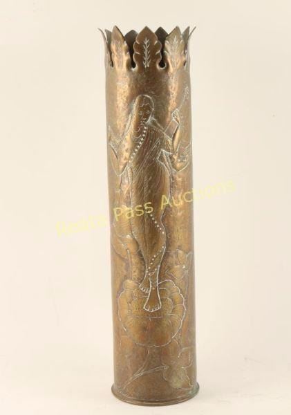 Shell casing shows a hand hammered image of lady on a lotus flower and other flowers. Marked 'ATE619' on base. Measures 13 1/2"x3 3/8".
