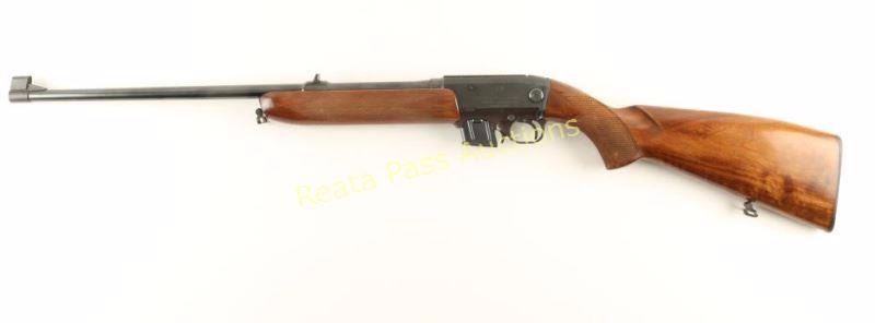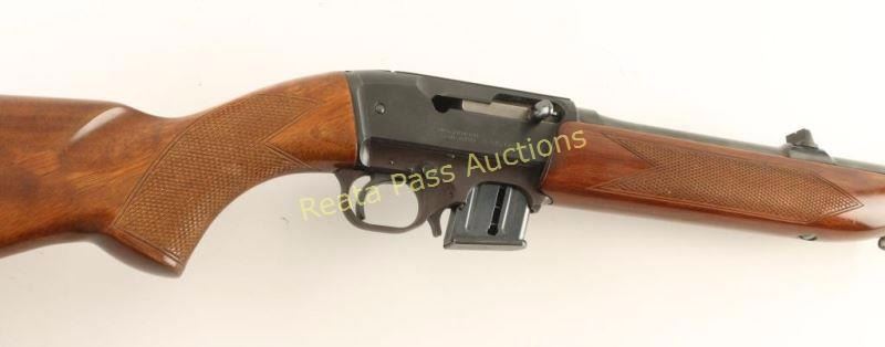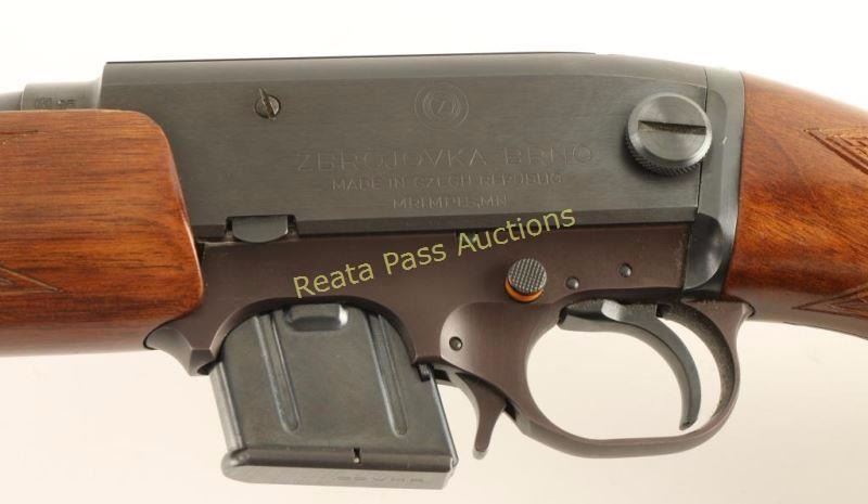 Collectible Czech made semi-automatic takedown rifle chambered in .22 Magnum. Features a blued finish, 20.5" barrel, ramped & hooded front sight, dovetailed rear window sight, 6 round magazine, smooth trigger, integral scope rail cuts on receiver, sling swivels, push button safety, checkered wood forend and pistol grip shoulder stock with factory buttplate. Rifle exhibits approximately 98%+ original finish showing only a few light handling marks. Action is smooth, bore is pristine and wood stocks are near fine with a few small blemishes. Condition is near excellent. ***Modern Firearm***
