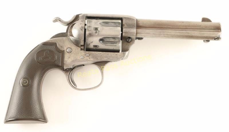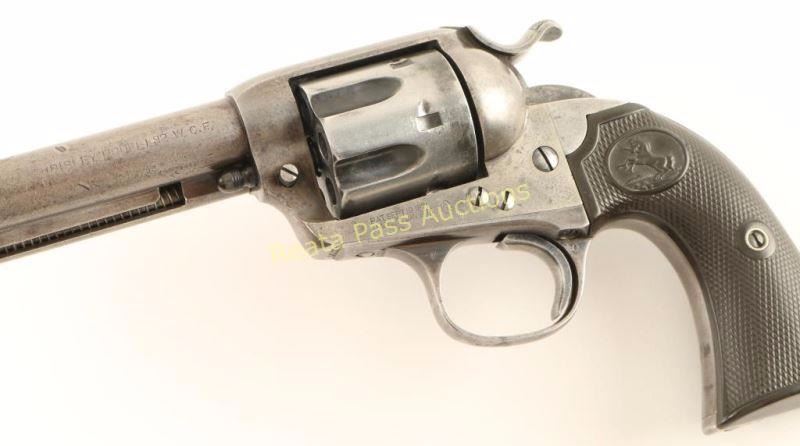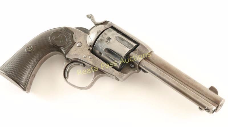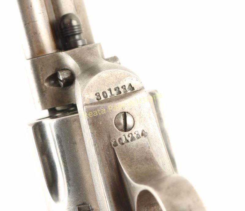 'First Generation' Single action revolver chambered in .32 Winchester Center Fire, circa 1907. Features a blued & case hardened finish, 4 3/4" barrel with two line address, ejector rod, blade front sight, 'v' notched rear sight, wide low-profile hammer spur, smooth trigger, fluted six-shot cylinder, and two-piece Rampant Colt checkered black hard rubber grips. Revolver exhibits small amounts of it's original case hardened colors on the frame under the cylinder pin release and remnants of bluing in the cylinder flutes & in other protected areas with the balance of the revolver's metal surfaces turned to a mostly even light grey patina. The cylinder pin was likely replaced. The patent markings are clear, the barrel markings are faint and all serial numbers are matching with the last four digits scratched onto both grips. Triggerguard is stamped with 'VP' inside a triangle and '6'. Action is crisp with all four clicks & good lock-up, bore is good with some very shallow pitting and grips are very good. Condition is good+. ***C&R Firearm*** ***Modern Firearm***