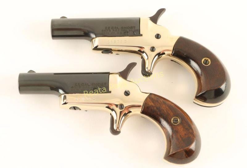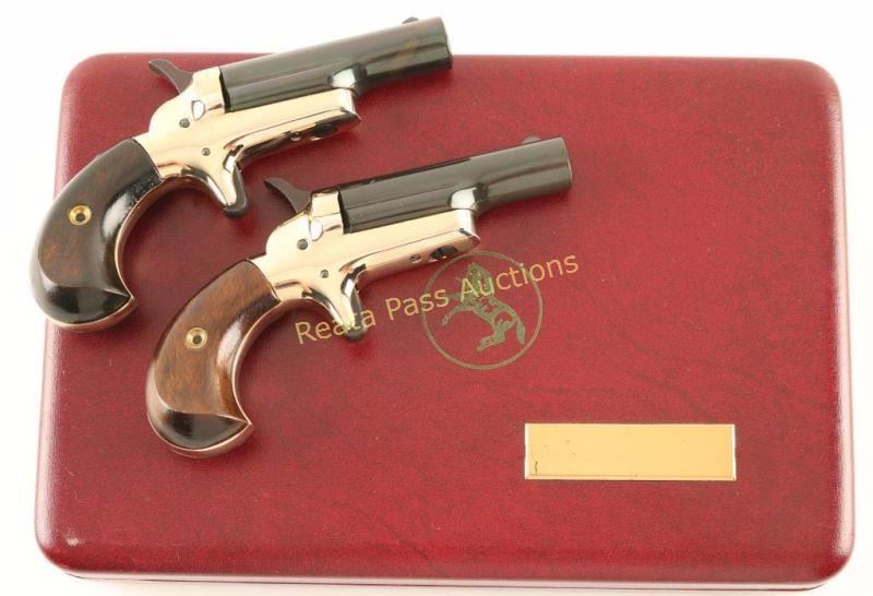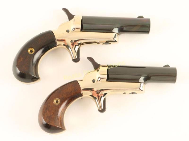 '4th Model' Cased consecutive numbered pair of single shot derringers chambered in .22 short, circa 1960's. Feature 2.5" swing out barrels, fixed front sights, polished brass plated frames, spur triggers, checkered hammer spurs, and two-piece walnut bird's head grips. Includes a velvet lined factory display box. Pistols show little to no wear. Actions are sound, bores and excellent and wood grips are fine. Condition is excellent. ***C&R Firearm*** ***Modern Firearm***